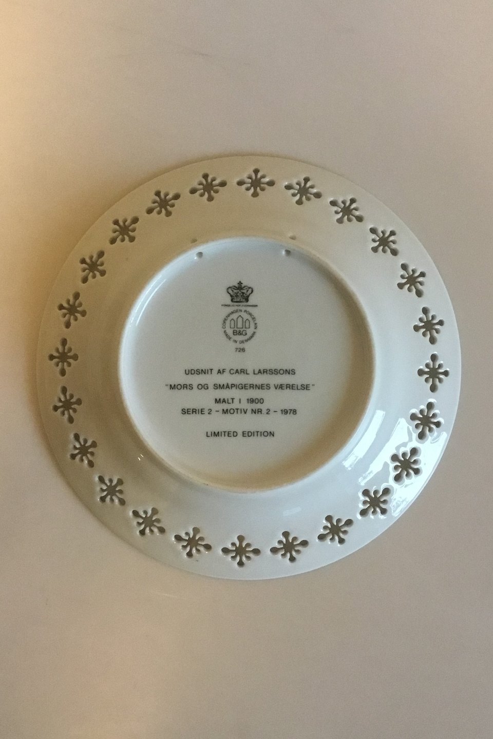 Bing & Grøndahl Carl Larsson platte "Mors og småpigernes værelse" Serie 2, Nr. 2, 1978. Måler 21,5 cm