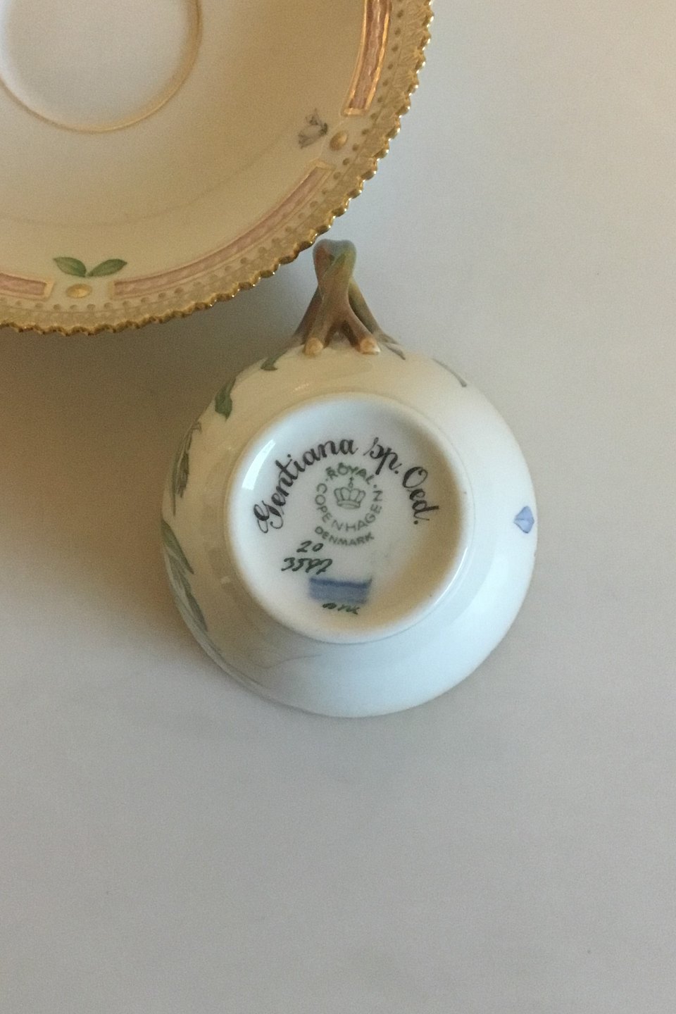 Royal Copenhagen Flora Danica Coffee Cup and Saucer No 20/3597. Latin Name: Gentiana sp. Oed. Measures Cup: 7 cm / 2 3/4 in. x 7.5 cm / 2 61/64 in. dia. Saucer: 13.8 cm / 5 7/16 in.