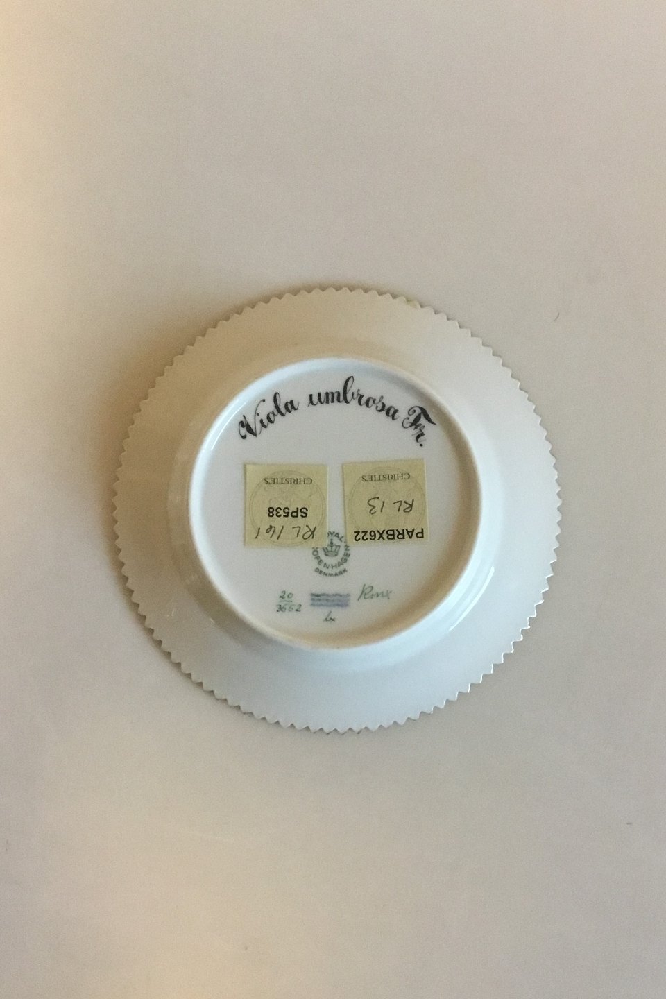 Royal Copenhagen Flora Danica Kagetallerken No 20/3552. Latinsk tekst: Viola umbrosa Fr. Måler 14,3 cm. Med afslag