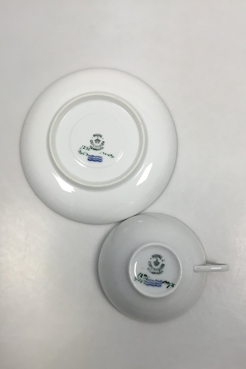 Royal Copenhagen White Porcelain with Gold Tea Cup and Saucer No 1275/9067. Measures Cup: 4.5 cm / 1 49/64 in. x 9.8 cm / 3 55/64 in. Saucer: 14.8 cm / 5 53/64 in.