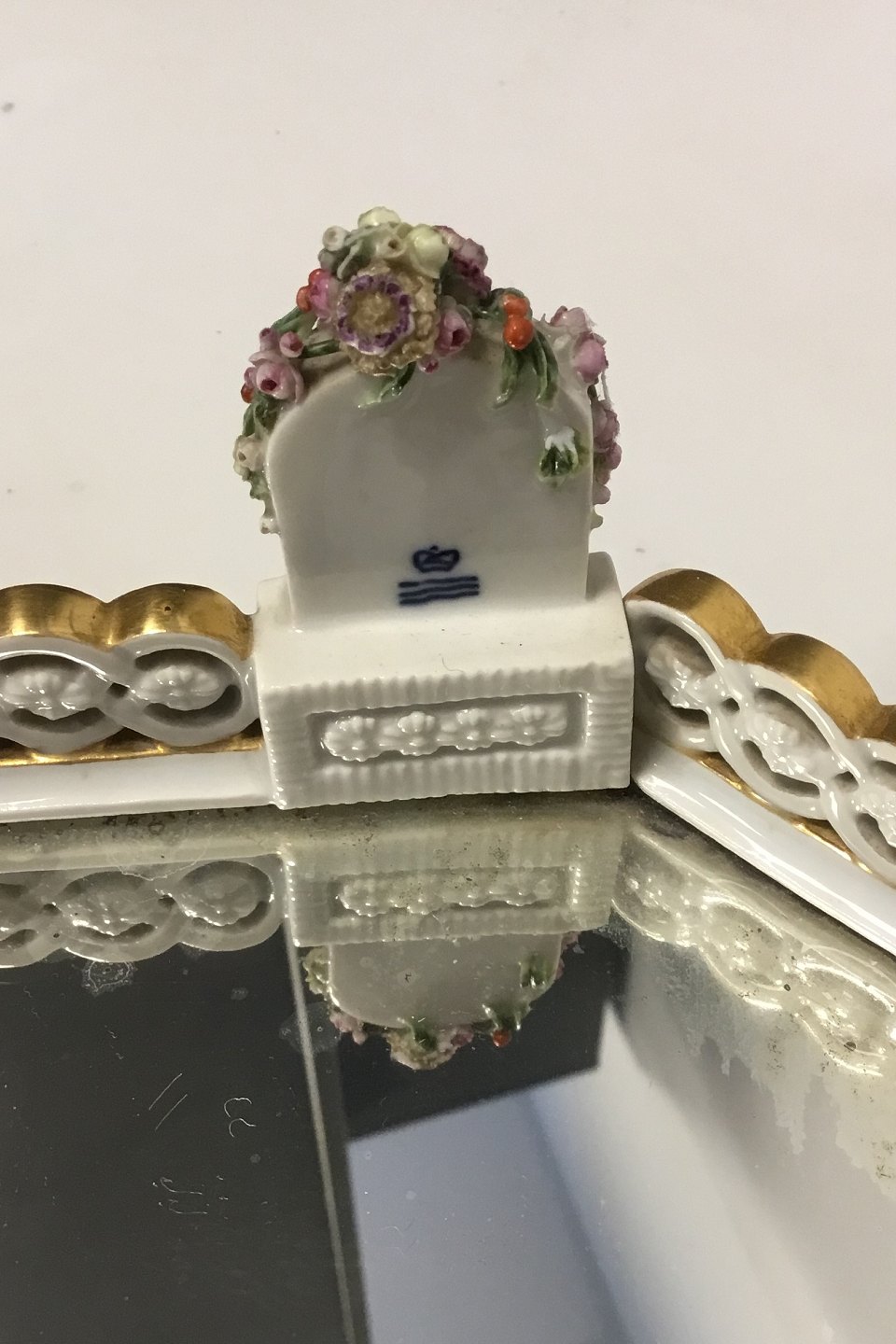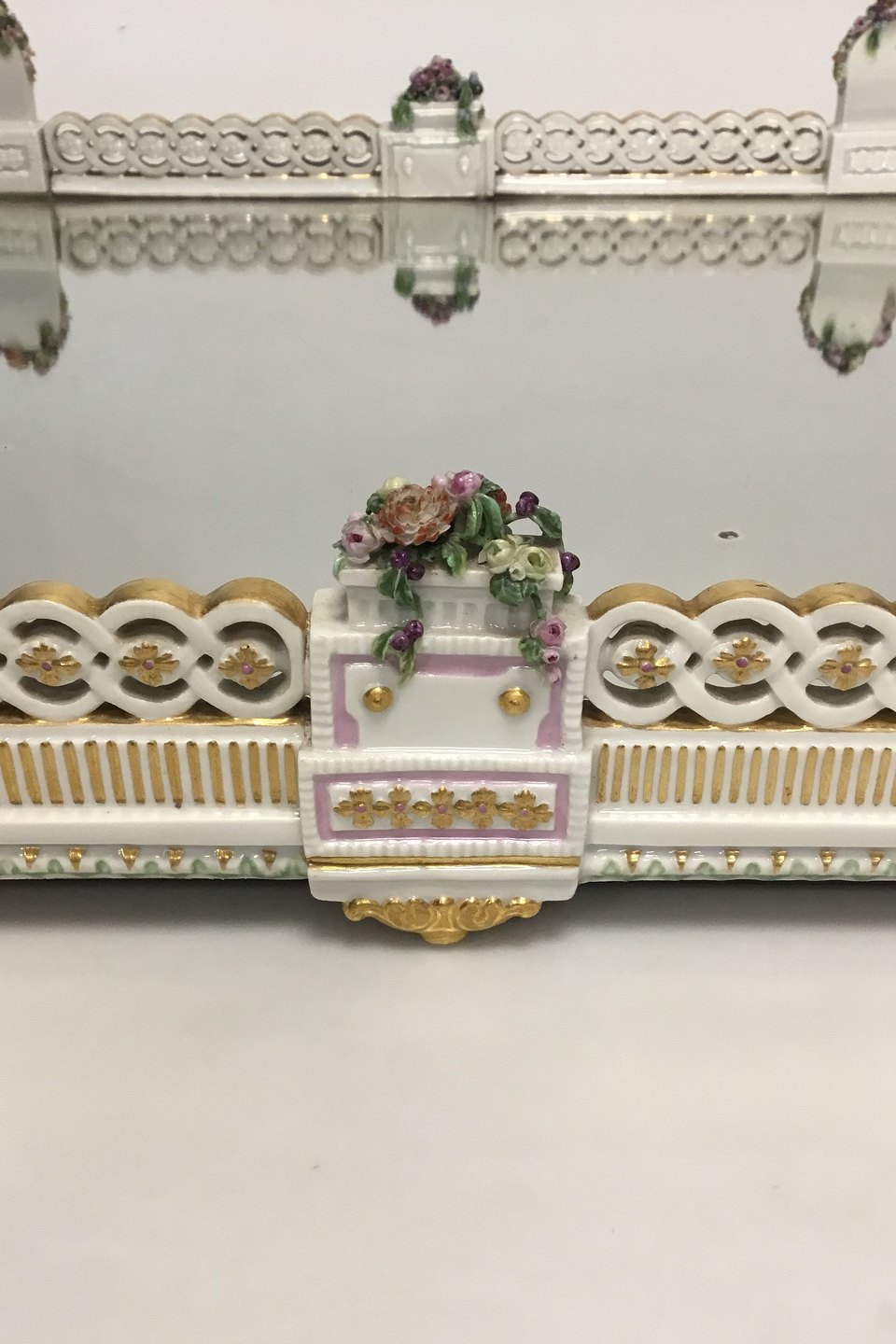 Large Royal Copenhagen Decoration tray with mirror/table garniture. Mirror with discoloration and a few small chips on flowers. Measures 37 cm / 14 9/16 in. x 52 cm / 20 15/32 in.