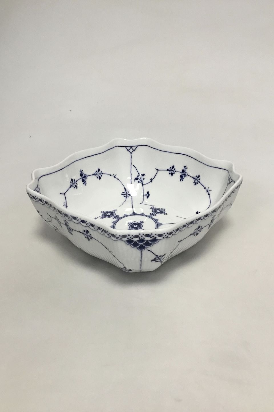 Royal Copenhagen Musselmalet Halvblonde firkantet Skål No 581. Måler 22,6 cm fra side til side, 25 cm fra hjørne til hjørne.