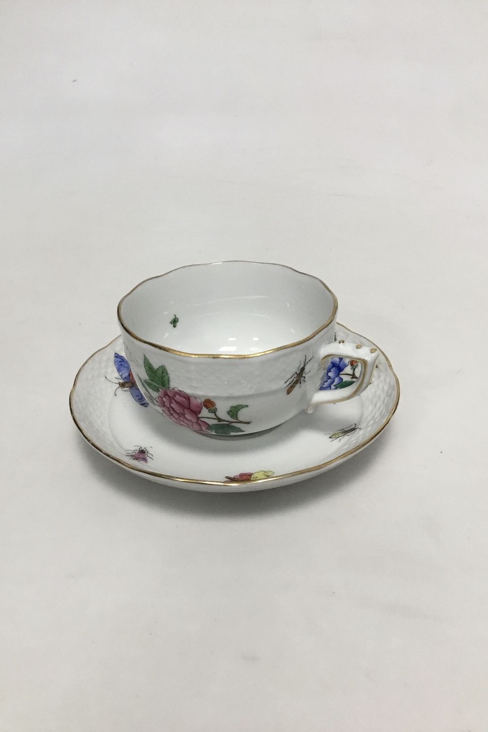 Herend Porcelain Hand-painted coffee cup and saucer with insects, butterflies and flower. Slight wear on gold rim. Diameter cup excl. handle: 8,5 cm (3 11/32"), saucer diameter: 13,5 cm (5 5/16").