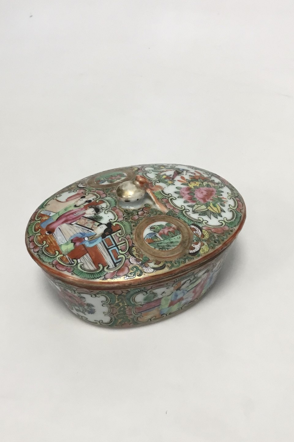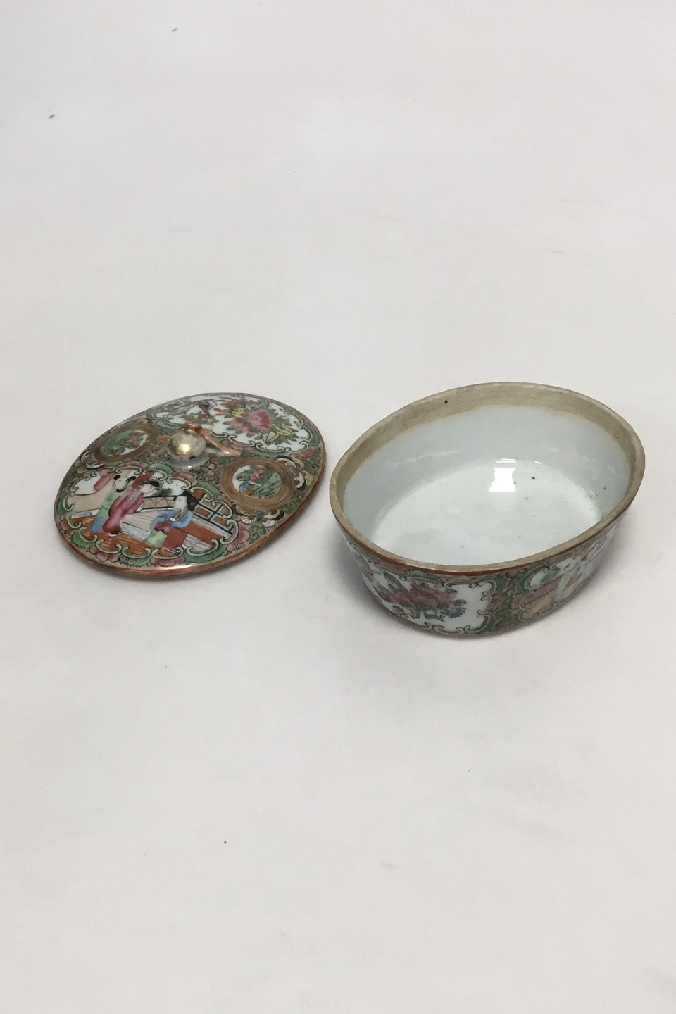 Chinese Canton (gold and green) tureen. Palace scenery and birds and butterflies. Ca. 1850. L: 13 cm (5 1/8"), H: 6,5 cm (2 9/16")