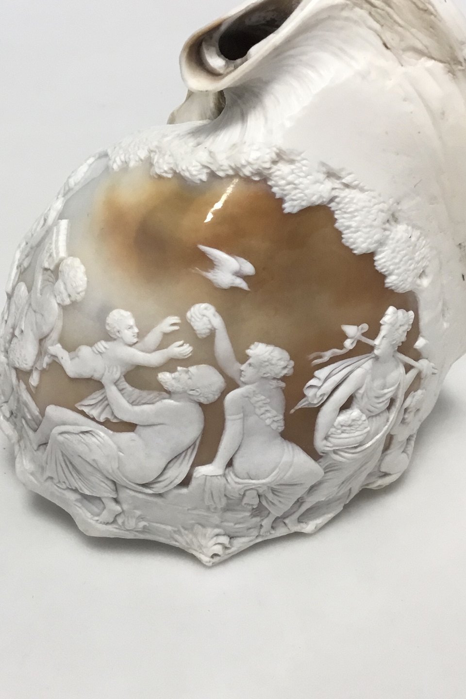 Cameo carved conch with classic motives. Victorian era ca. 1880. H: 15,5 cm (6 7/64")