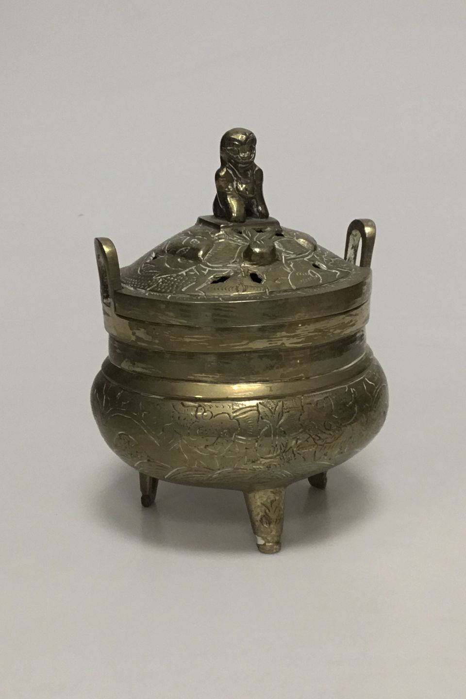 Kinesisk røgelseskar i messing med gennembrudt låg prydet med foo hund. Midten af 20 årh. H: 16,5 cm
