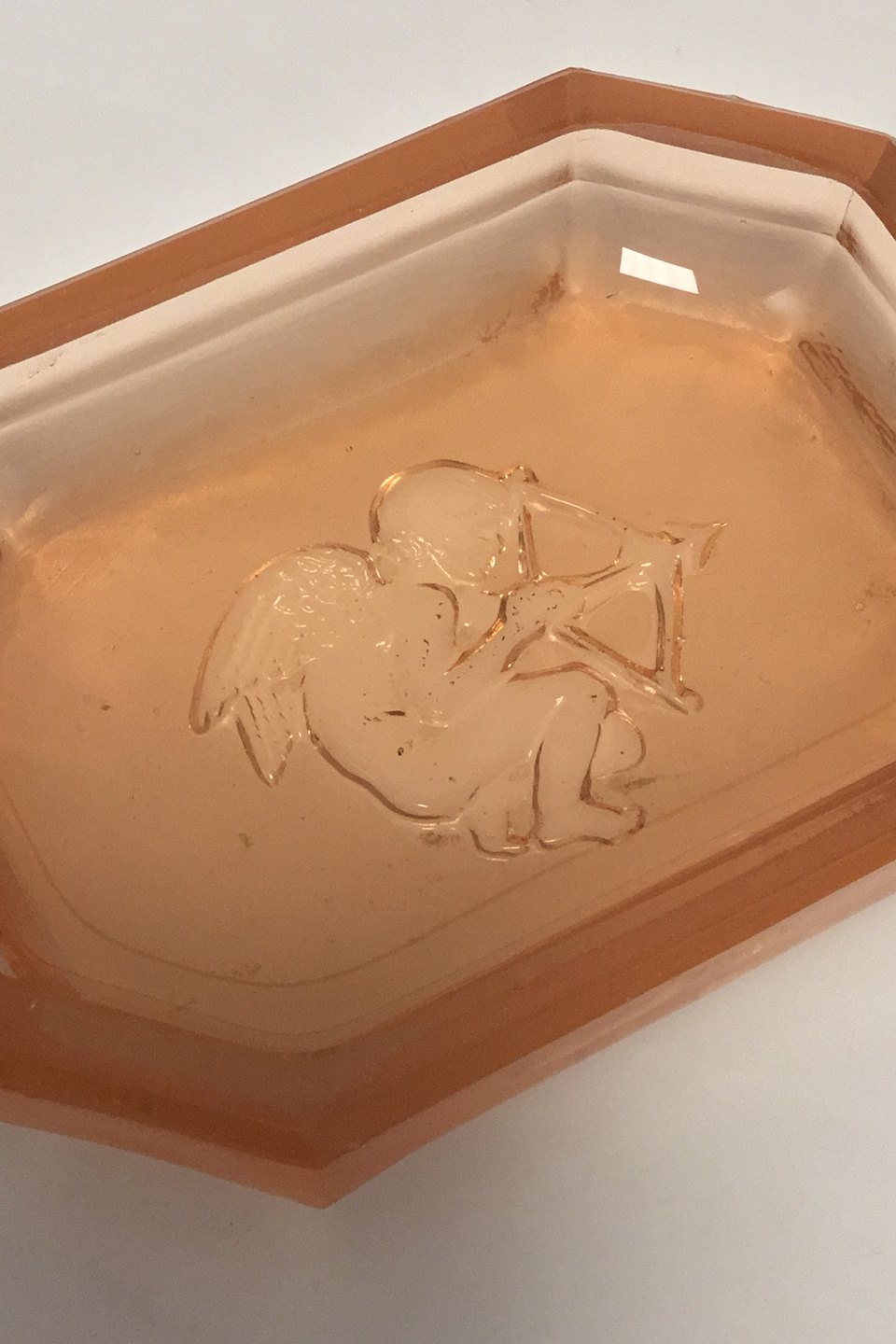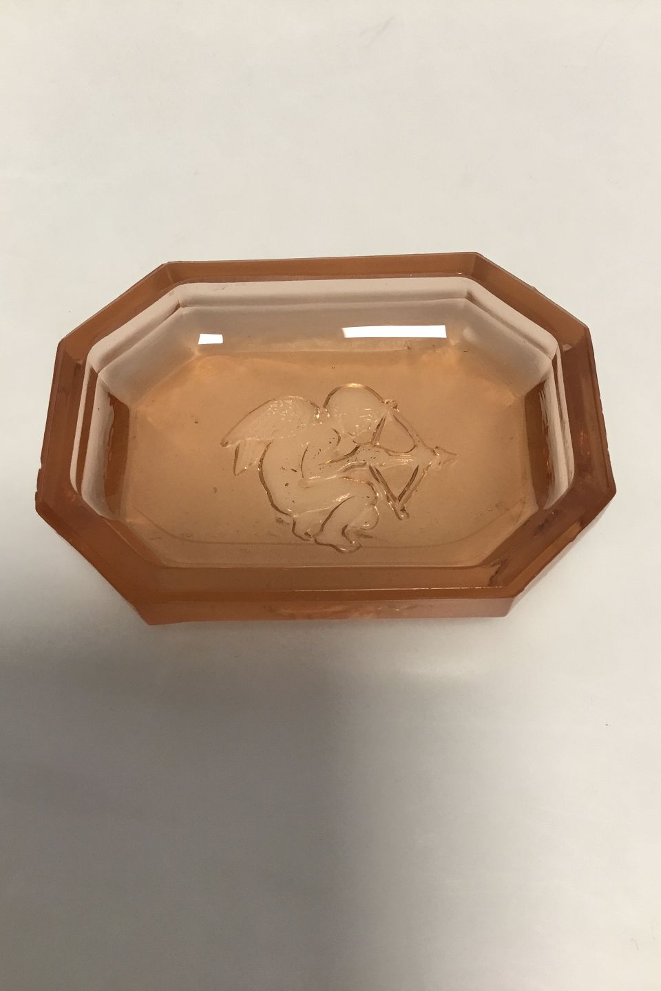 Oktogonalt Saltkar i lysebrunt glas med ætset motiv af kerub (Amor) med bue og pil. L: 7,0 cm. B: 5 cm.
