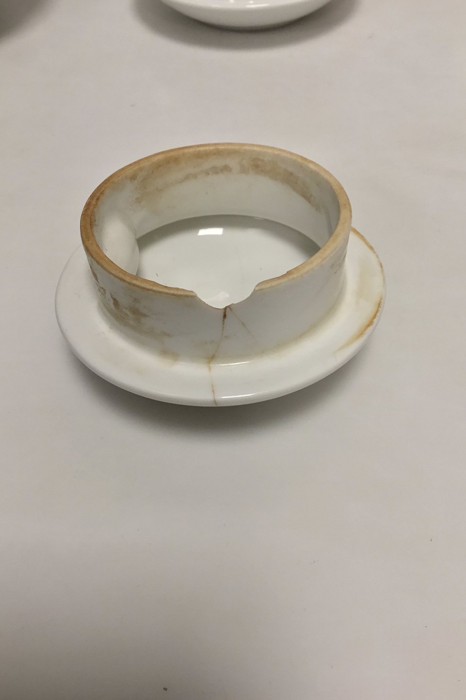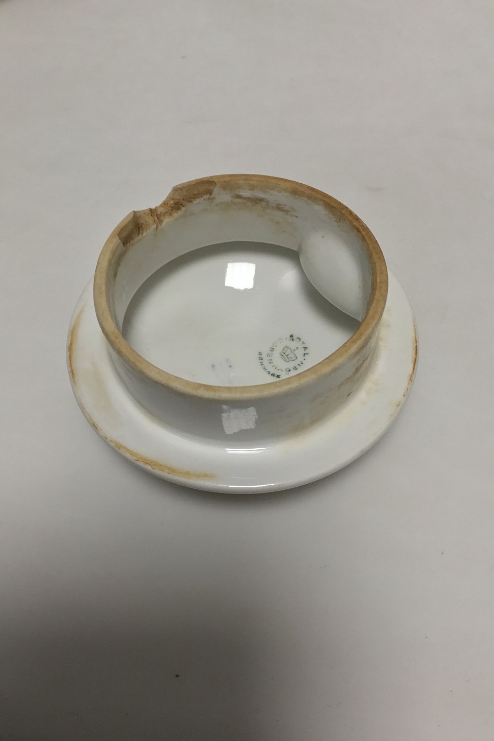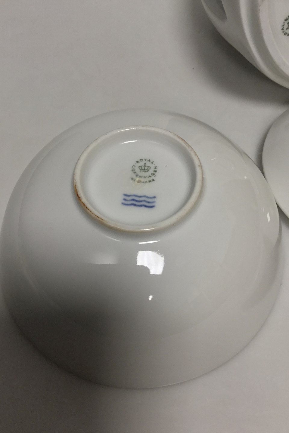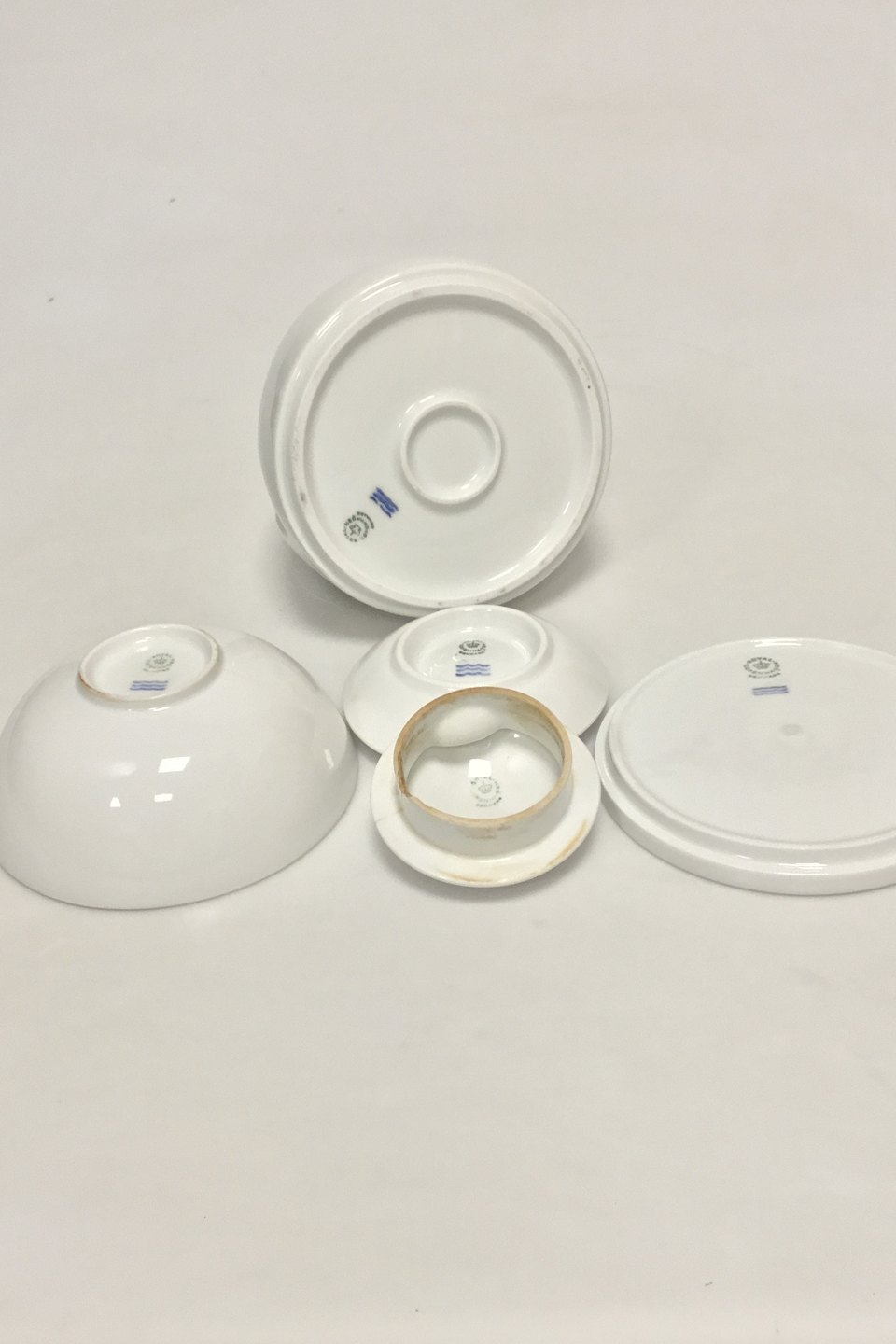 Royal Copenhagen hvid porcelæns kaffkande med låg, fad, æggebæger og skål i et. Låg med skader. H: 20 cm