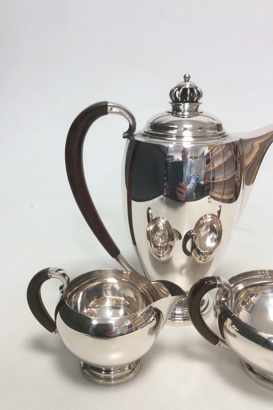 Theodor Sabroe Art Deco Danish Silver Coffee Set with Pot, creamer and sugar bowl from 1942.