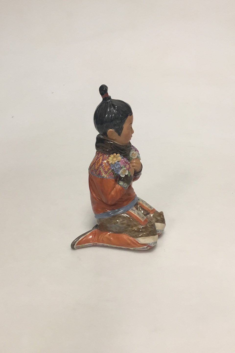 Royal Copenhagen Overglasur Figur af Grønlandsk Pige No 12415. Designet af Carl Martin-Hansen. Måler 15cm. Figuren har en pænt udført reparation på håre, se billeder. Der er desuden et par afslag på blomsterne