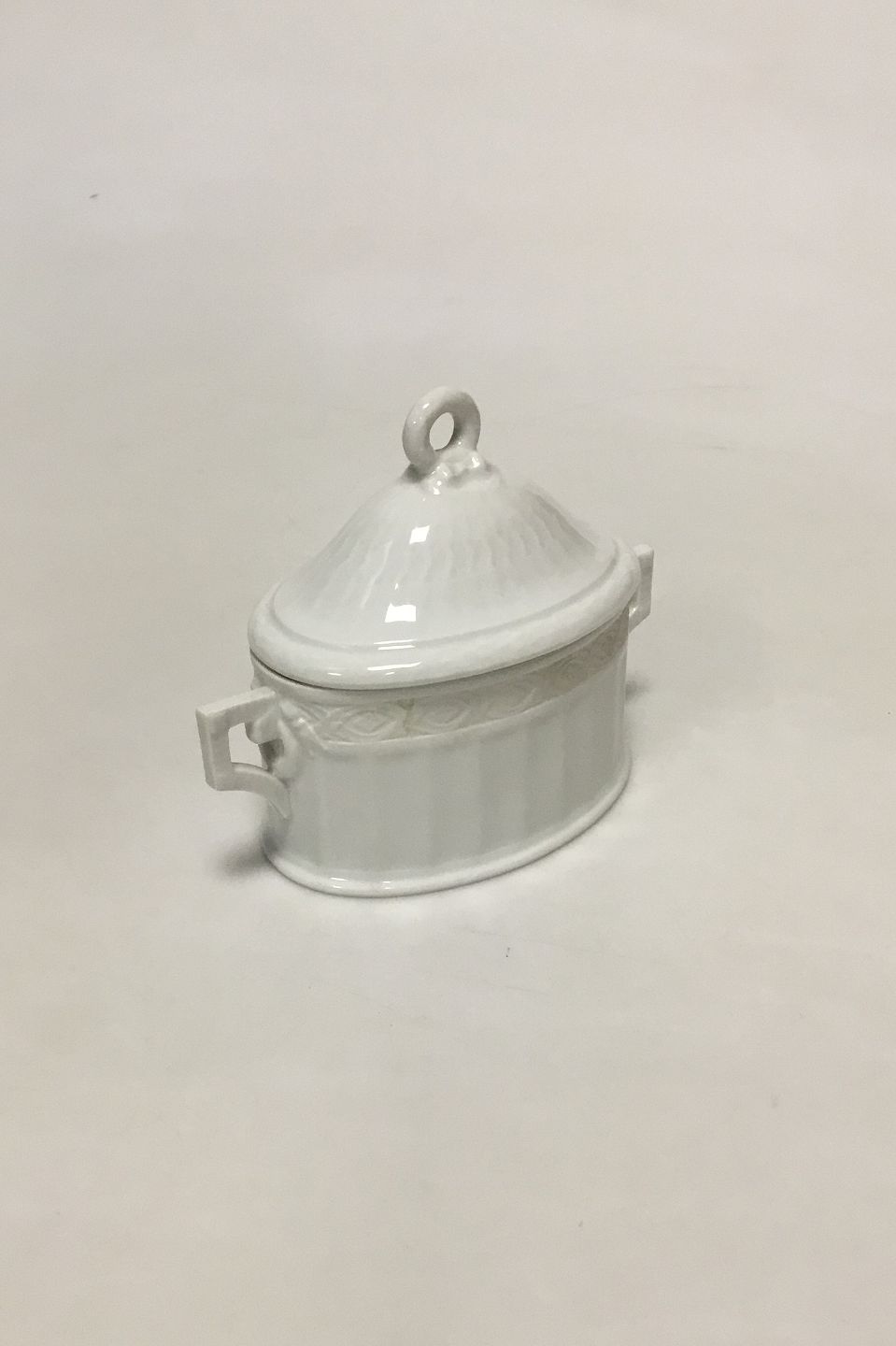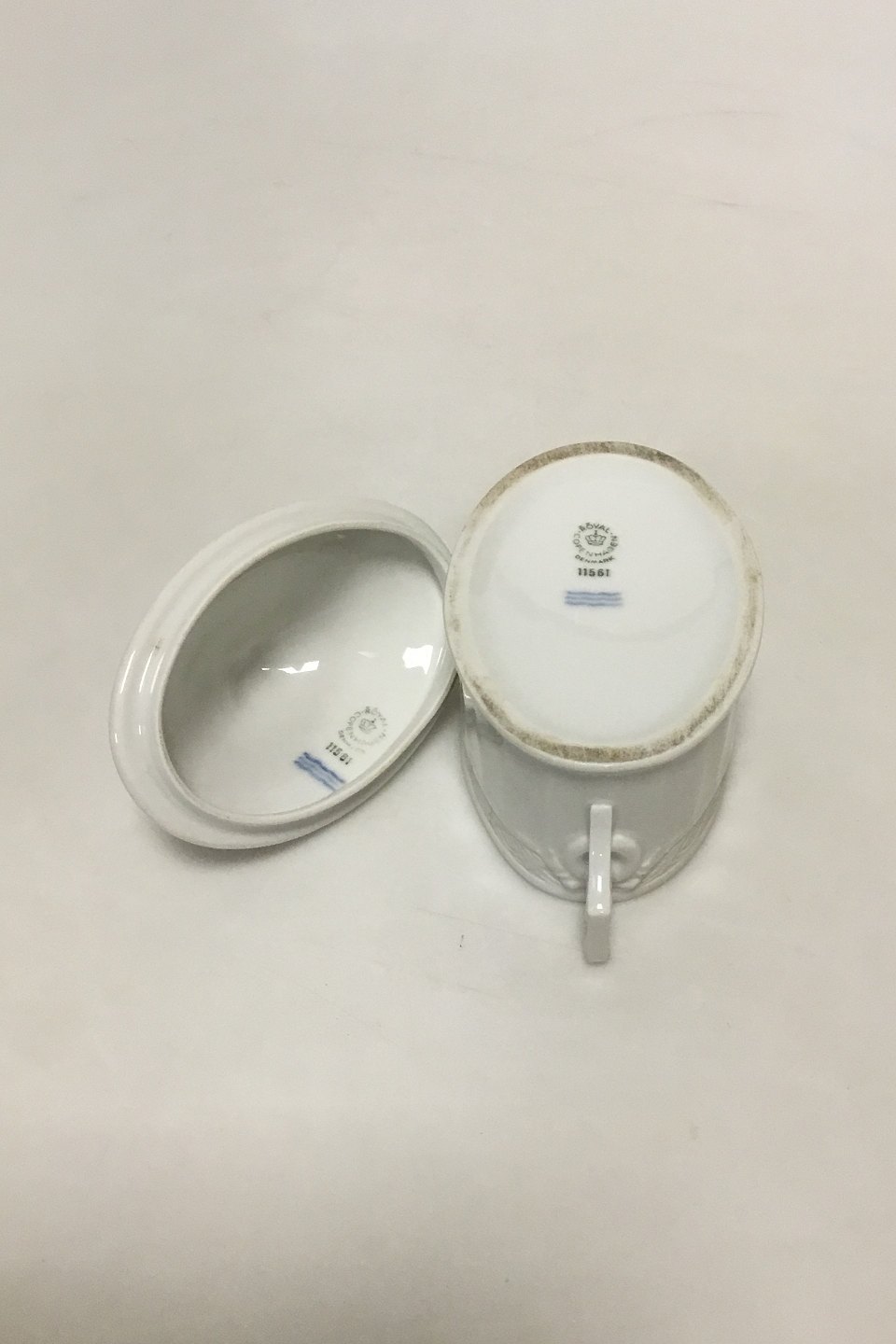 Royal Copenhagen Hvid Vifte Sukkerskål No. 11561 eller 161. Måler 6 cm / 2,36 in. x 9 cm / 3,54 in.uden hanke. Højde med låg er 9,5 cm / 3,74 in..
