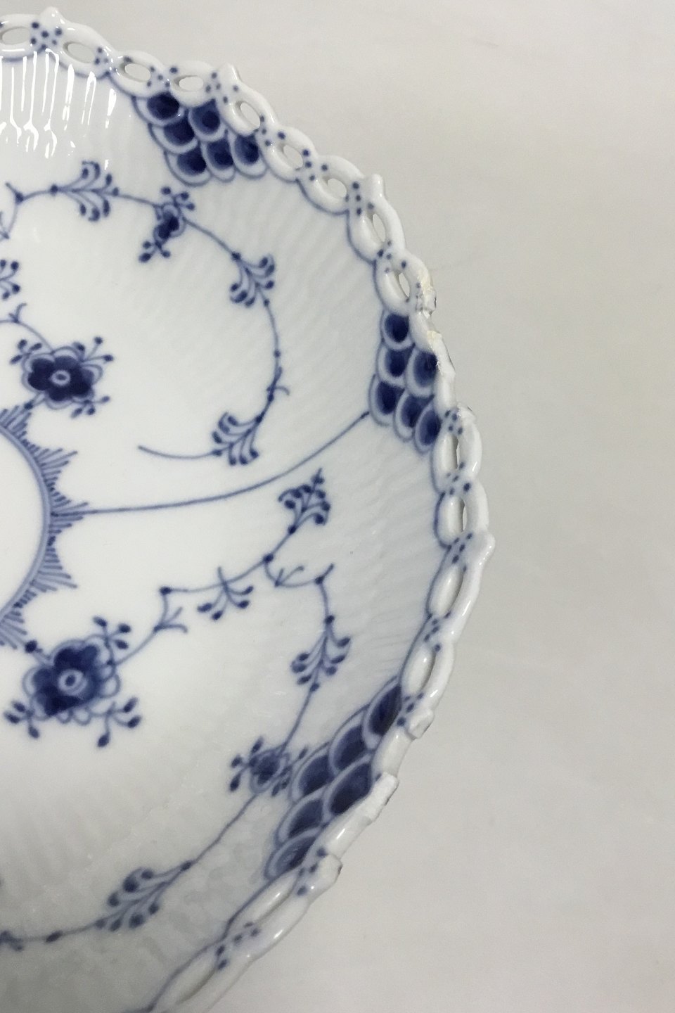 Royal Copenhagen Blue Fluted Full Lace Cake Bowl on Foot No 1020. Measures 14.5 cm x 20.5 cm / 5 45/65 in. x 8 5/64 in. Chips on edge.