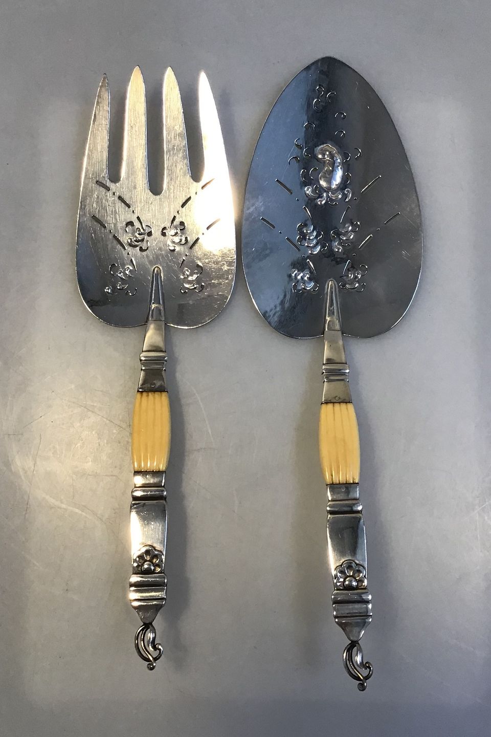 Georg Jensen Silver Fish Serving Set (1927) Partly bone handle Floral decoration Measures Server 27.5 cm(10 53/64 in) Fork 26 cm(10 15/64 in)