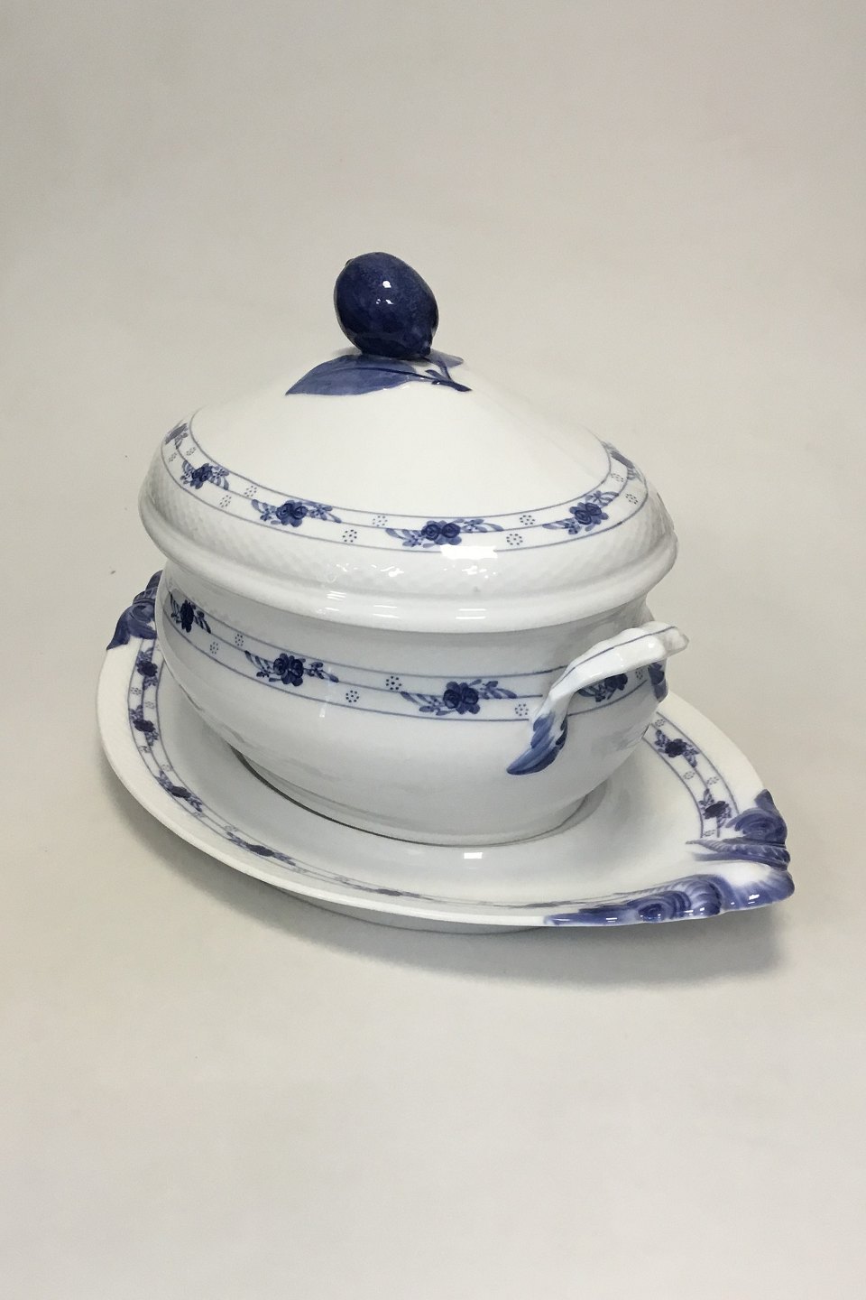 Royal Copenhagen Rosenknop Terrin med underfad No 8134. Måler 45 cm. Med chip og brændingsfejl