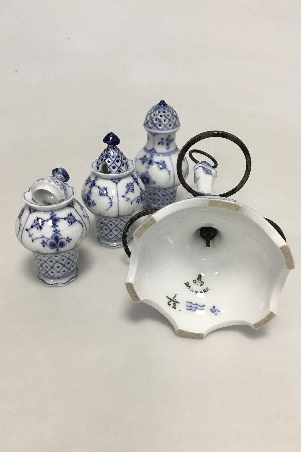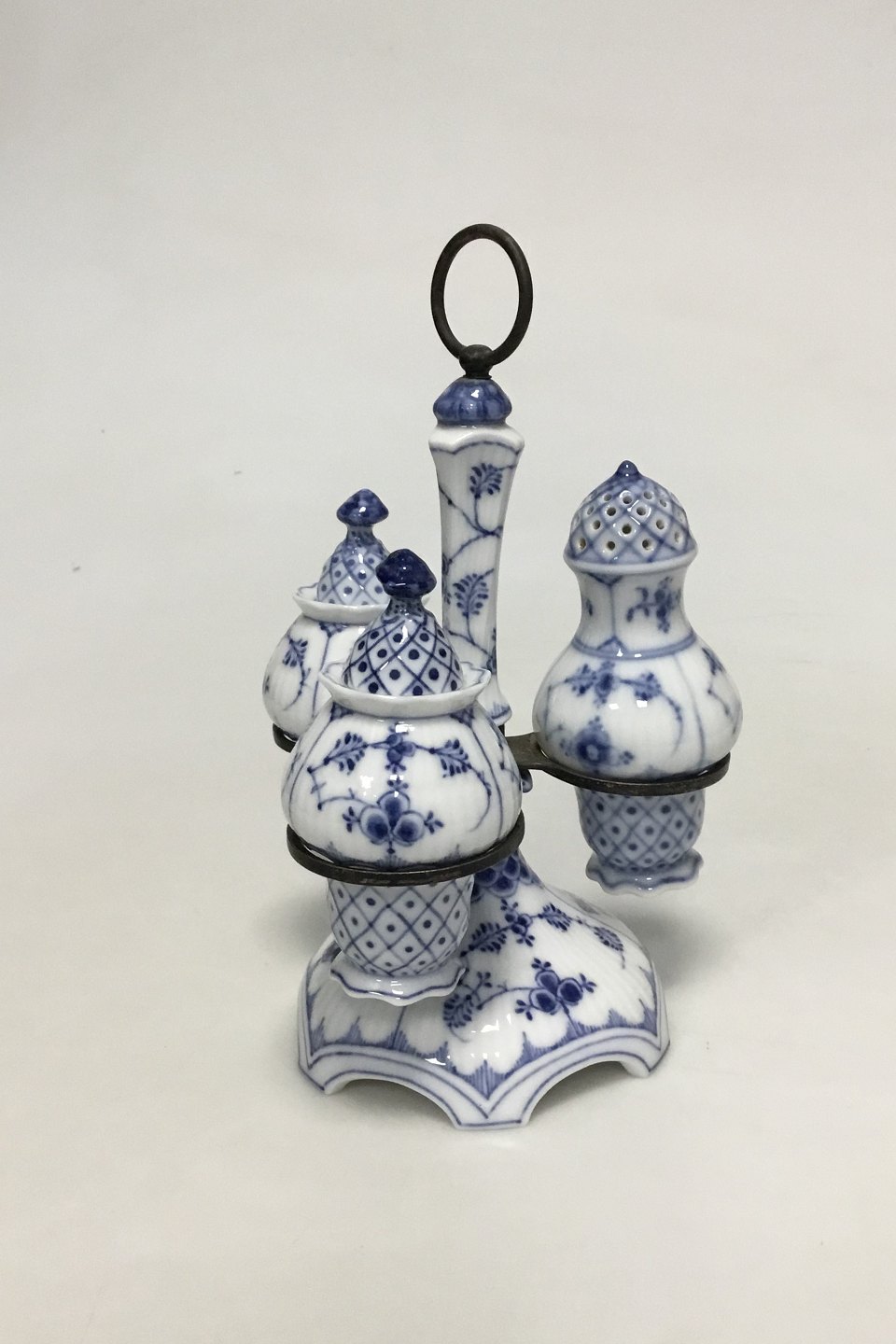 Royal Copenhagen Musselmalet Riflet Plat de Ménage No 62. Roterbar holder af messing. Måler 17 cm (6 11/16 in.) høj. Afslag på foden af saltbøsse