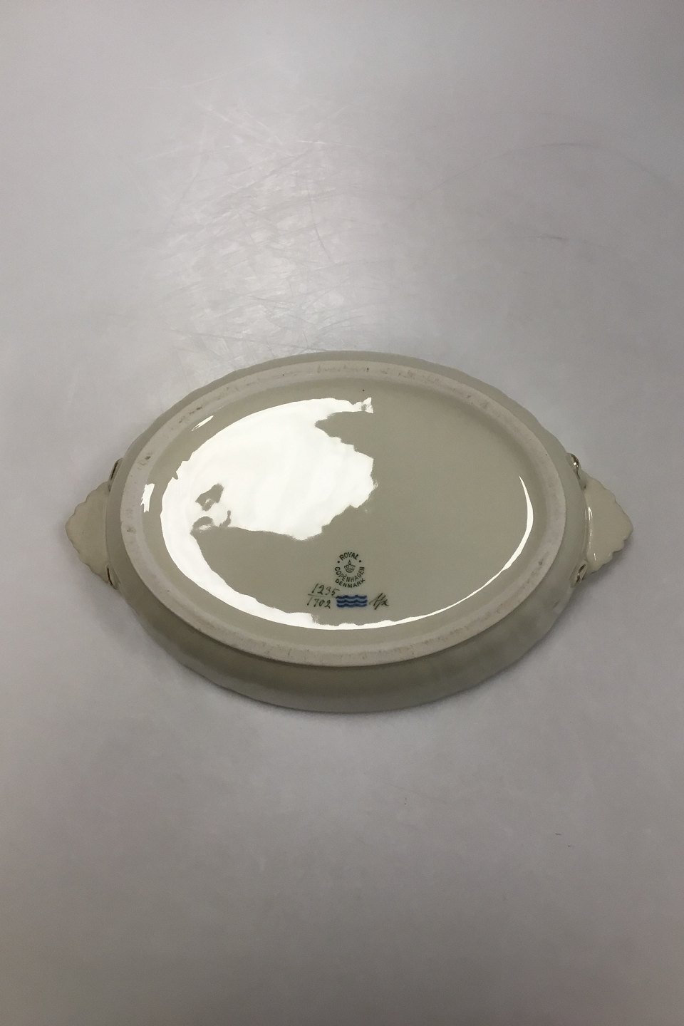 Royal Copenhagen Creme Svejfet med Guld (Stel 1235) Fad No 1702. Mangler låg. Måler 27 x 19 x 7 cm (10 5/8 x 7 31/64 x 2 3/4 in).