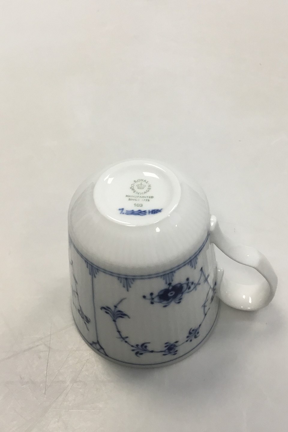 Royal Copenhagen Musselmalet Riflet Krus No. 103. Måler 10.3 cm / 4,05 in. Indeholder 37 cl. / 12.51 oz.