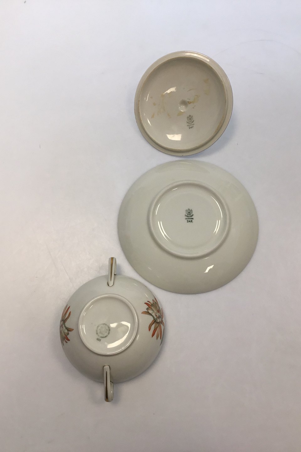 Bing & Grondahl Cactus Bouillon Cup with Lid and Saucer No 481 and 247. Measures Cup: 8.5 cm / 3 11/32 in. x 12.5 cm / 4 59/64 in. dia. Saucer: 17.5 cm / 6 57/64 in.