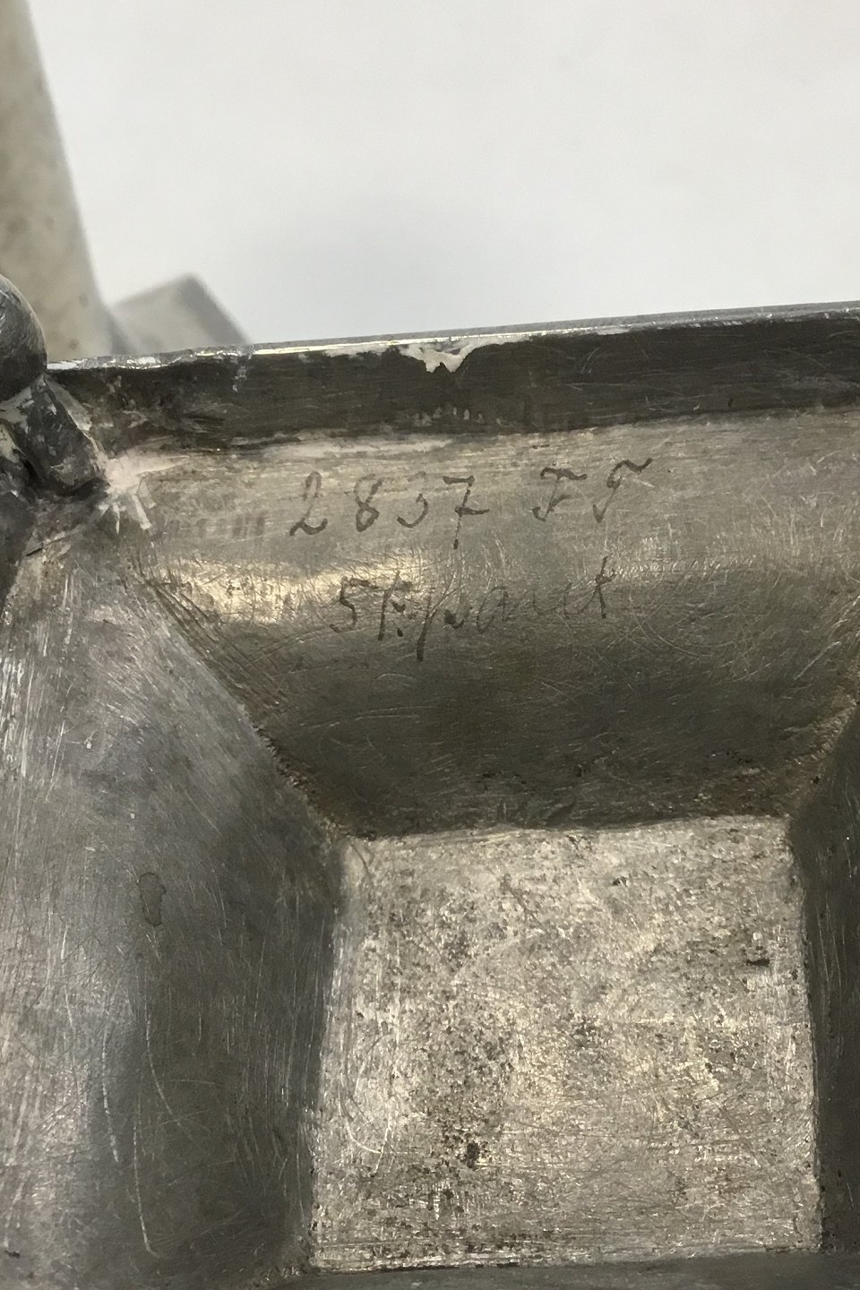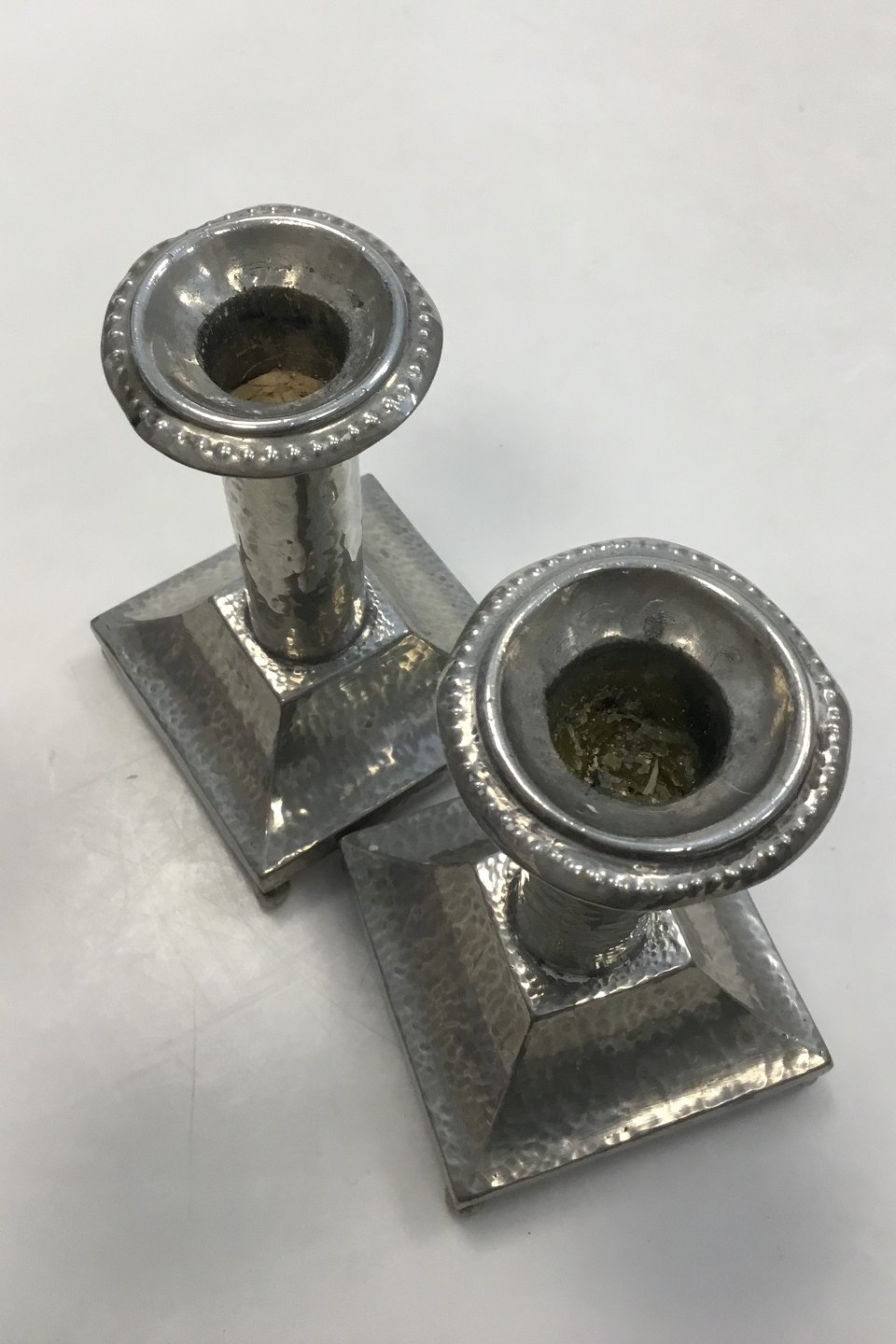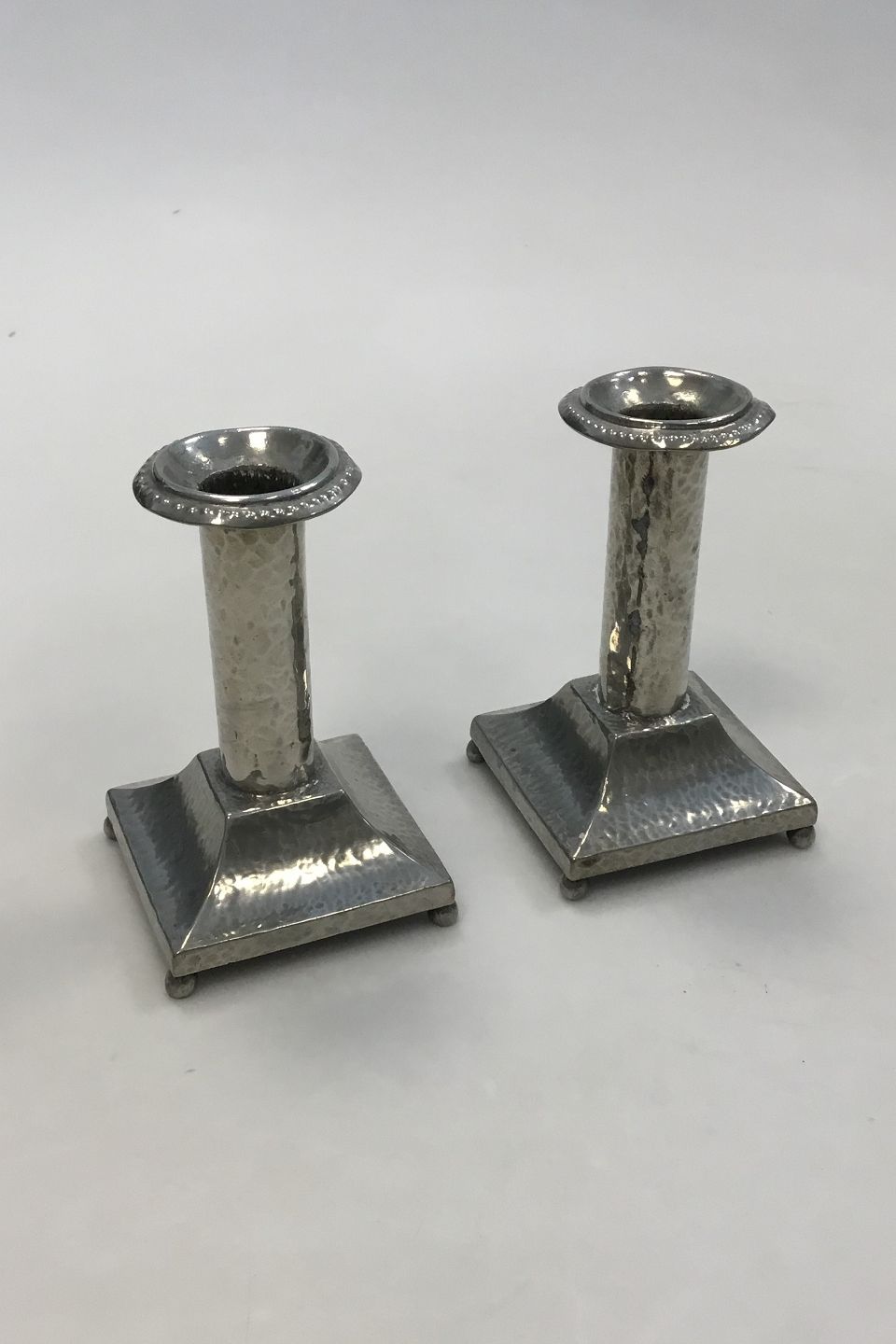 A Pair of hammered candlelight holders made of Pewter. With skews at the top. Square base. Measures 11.5 cm / 4 17/32 in.