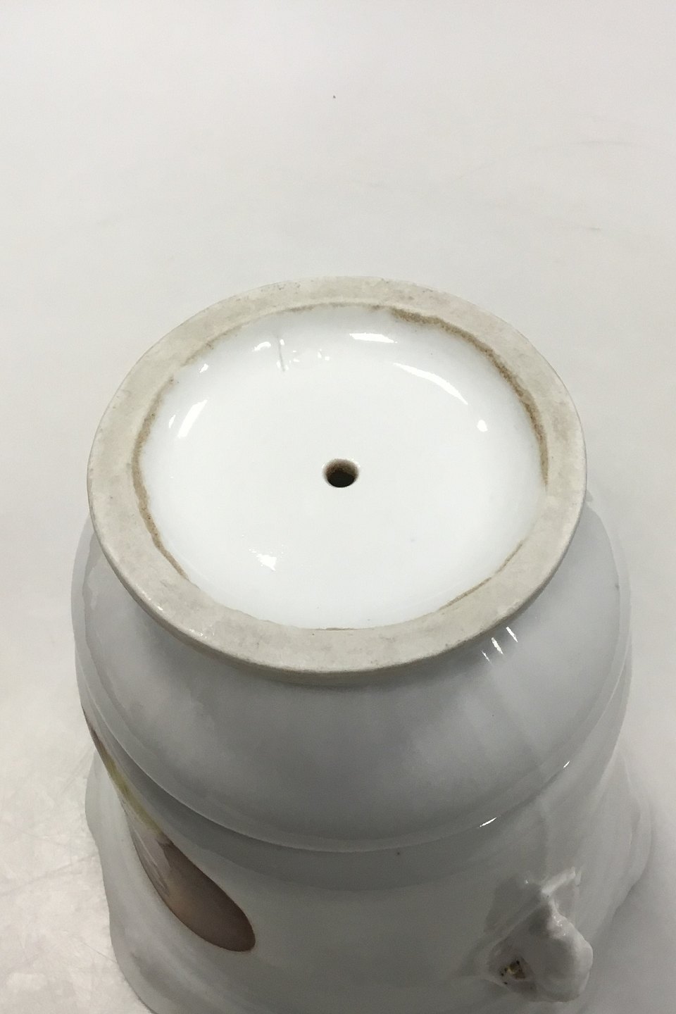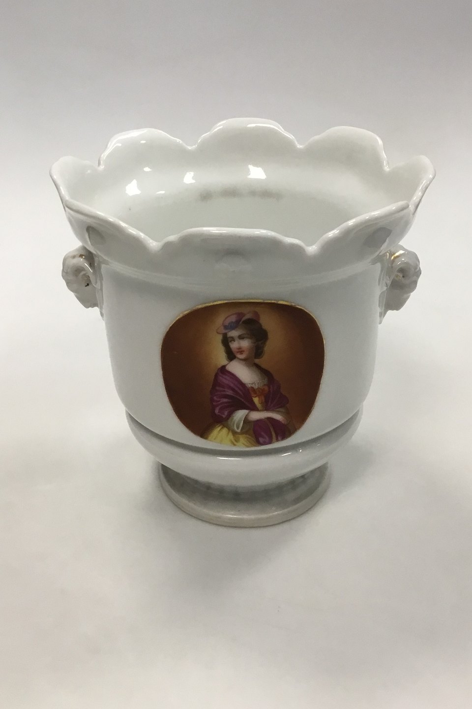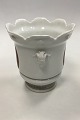 Urtepotteskjuler af hvid porcelæn dekoreret med vædderhoveder og kvindeportrætter. Måler 19 cm(7 31/64 in.)