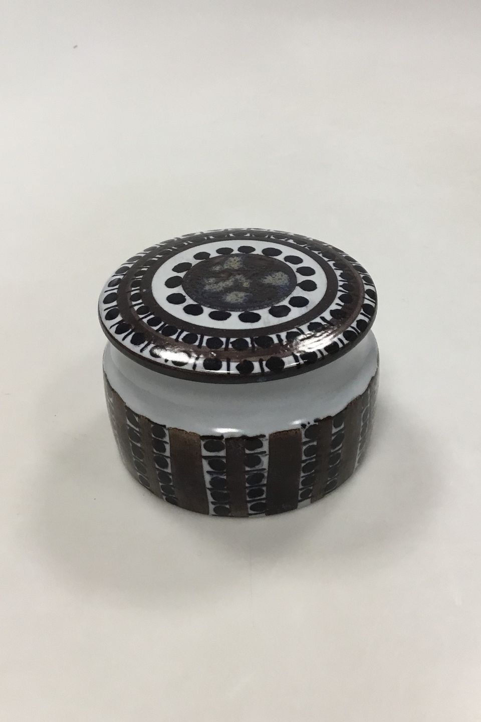 Royal Copenhagen Fajance Bonbonniere No 424/3167. Designed af Kari Christensen. Måler 6 cm x 10 cm dia.(2 23/64 in. x 3 15/16 in. dia.)