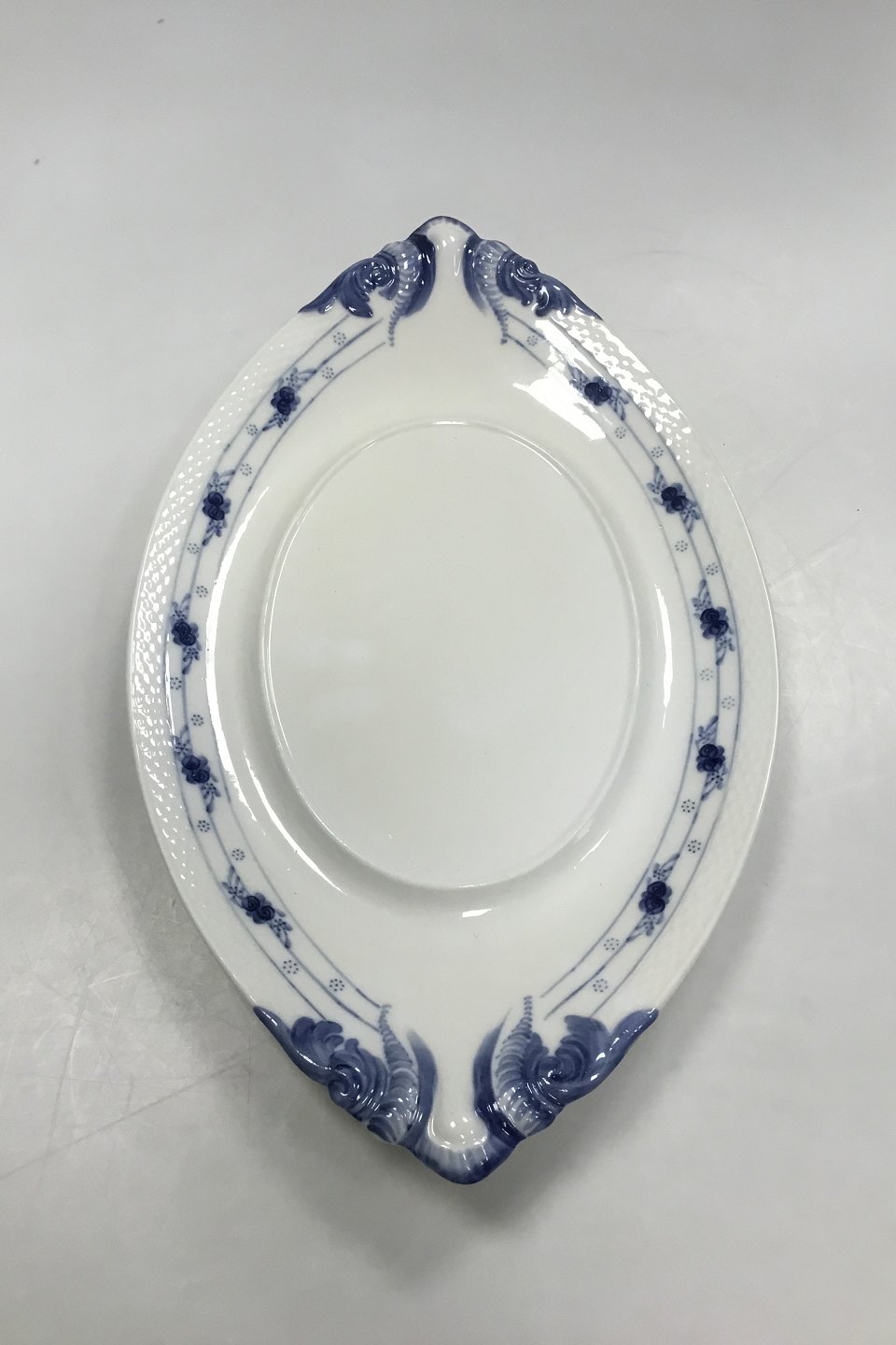 Royal Copenhagen Rosenknop Terrin u/låg No 8034 med underfad No 8035. Terrin måler 34 x 22 x 13 cm (13 25/64 x 8 21/32 x 5 1/8 in). Underfad måler 45 x 28 cm (17 23/32 x 11 1/32 in).