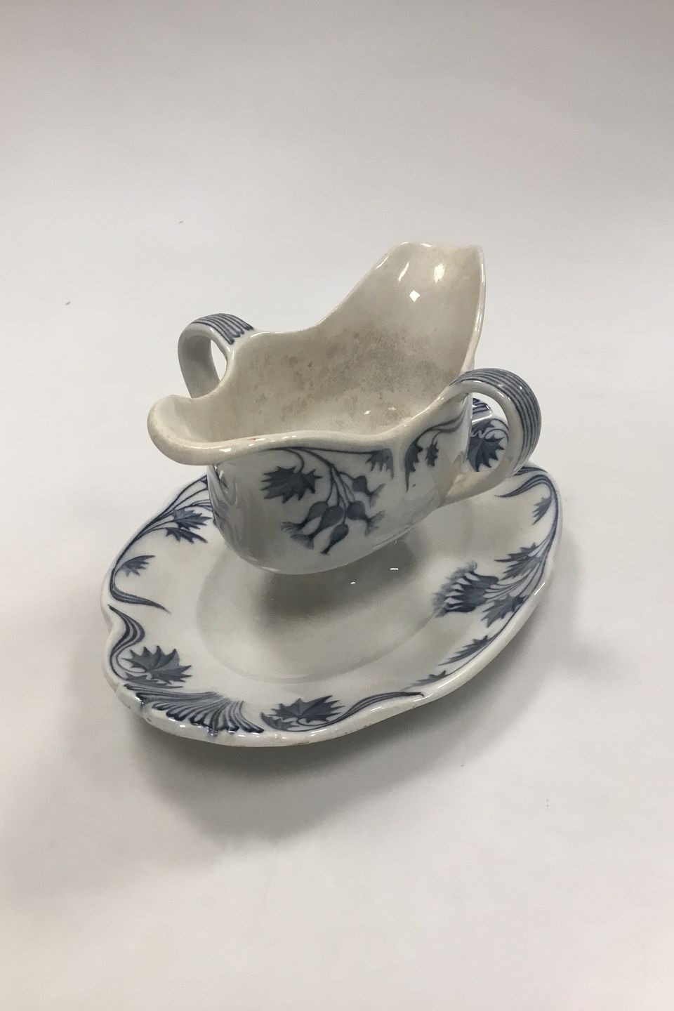 Villeroy og Boch Milla/Tidsel Sauceskål med fast underfad. Måler 22 x 15 x 12 cm (8 21/32 x 5 29/32 x 4 23/32 in). Underfad måler 25,5 x 17 cm (10 3/64 x 5 33/64 in). Fremstår med mindre afslag, misfarvning og/eller krakelering.