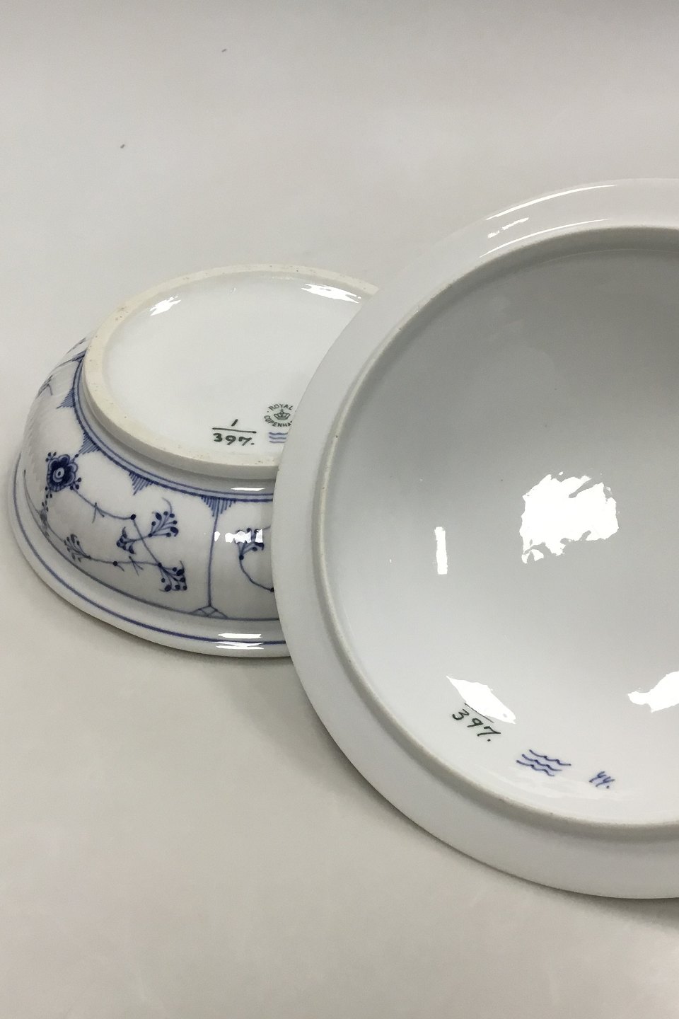 Royal Copenhagen Blue Fluted plain Lidded Bowl No 397. Measures 24 cm / 9 29/64 in. With a chip on the Lid