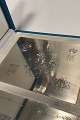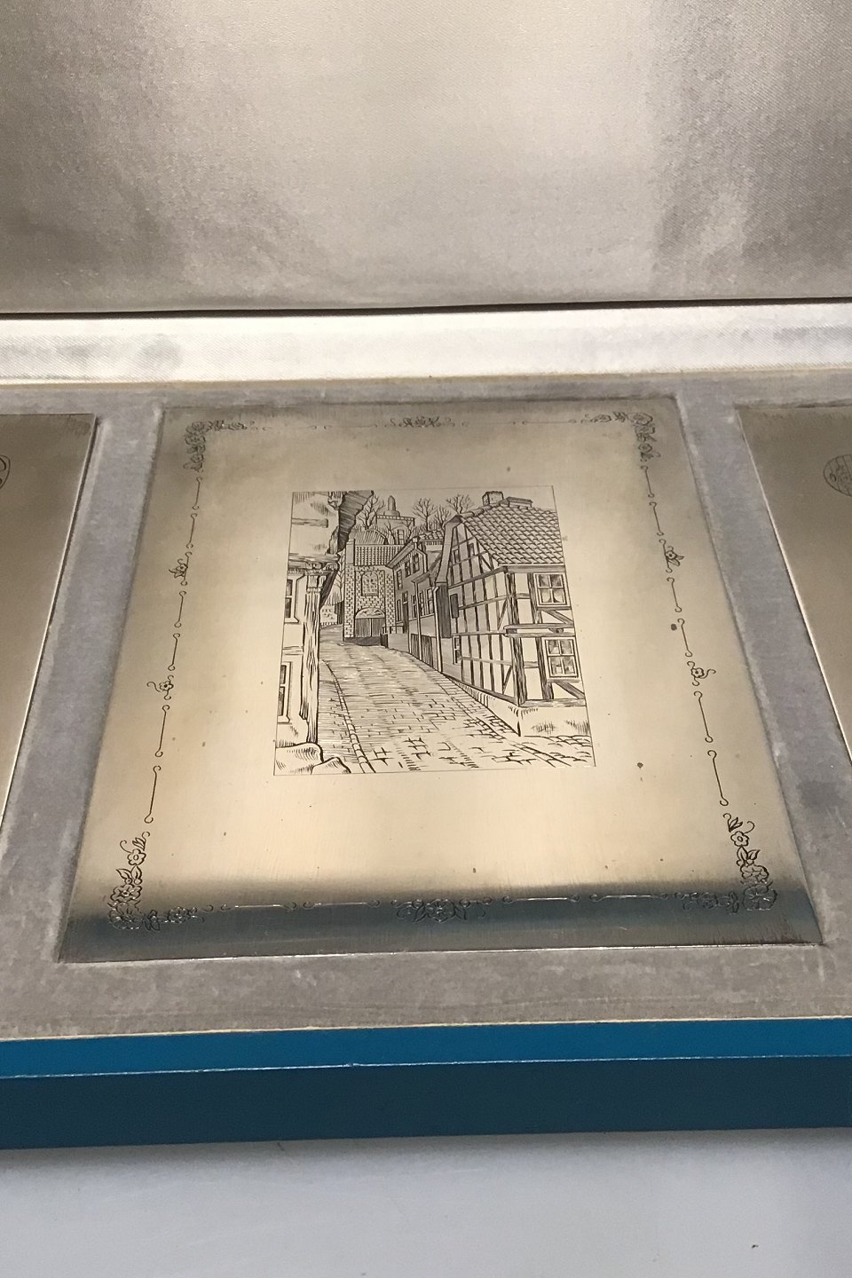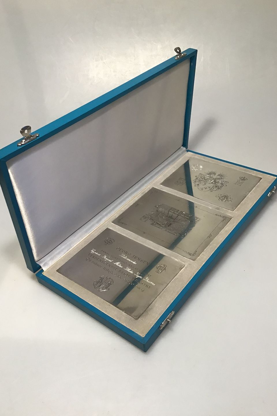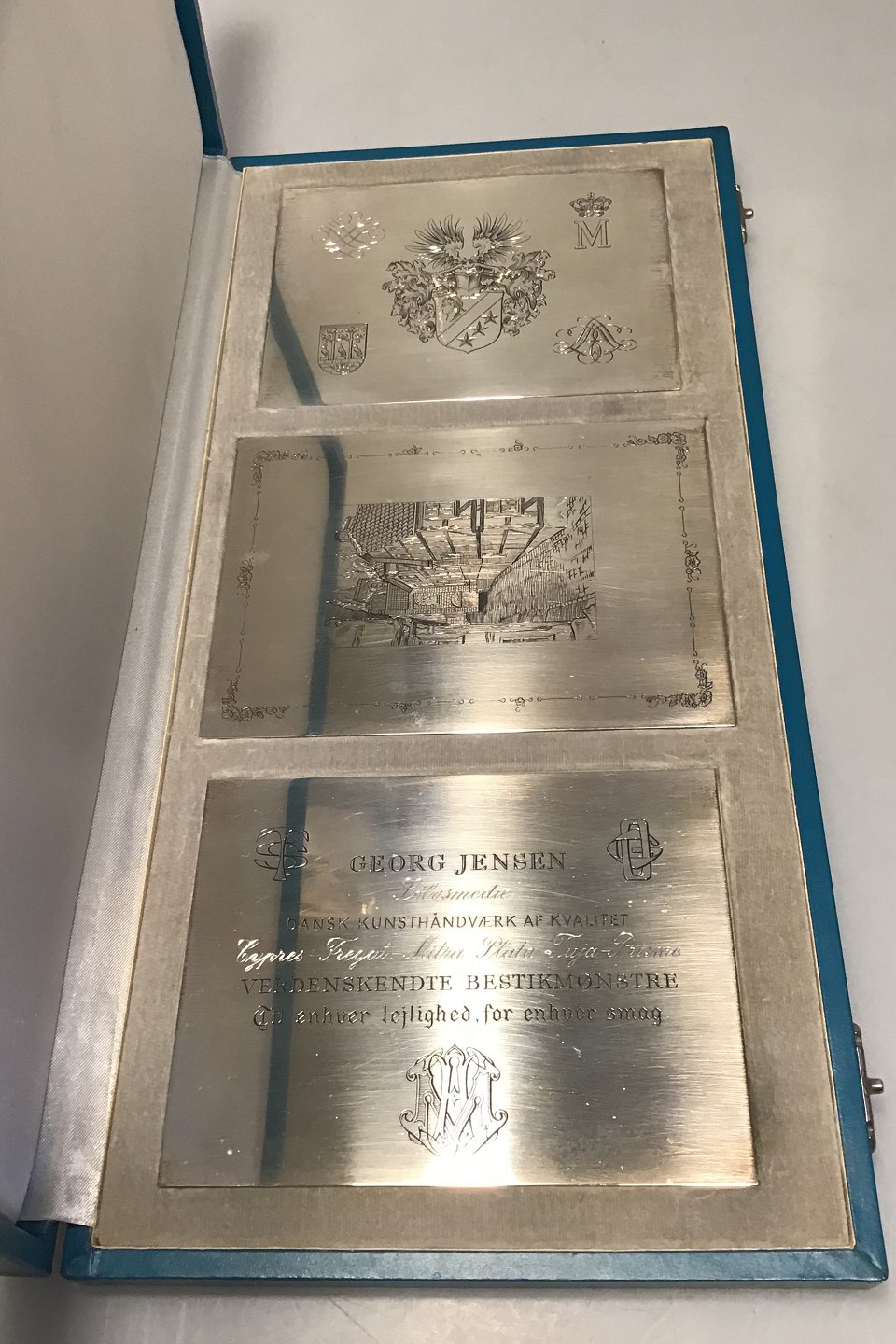 Georg Jensen Sterling Sølv Præsentationsæske med 3 sølvplader Unika Eksempler på gravering hhv bogstav/tekst, motiv og monogram/heraldik Måler hhv 9 cm x 12 cm, 9.5 cm x 13 cm og 9 cm x 12 cm(3 35/64 in x 4 23/32 in, 3 47/64 in x 5 1/8 in og 3 35/64 in x 4 23/32 in)( Antageligvis lavet til et salgsfremstød i USA)