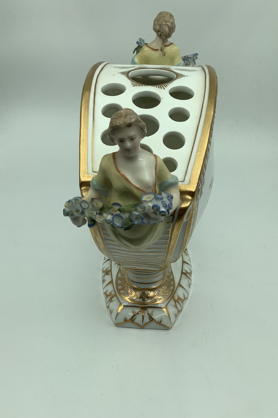 Decorated in colour and gold with flowers, handles shaped as figurines holding flower festoon H.18 cm./ 7.08 inches