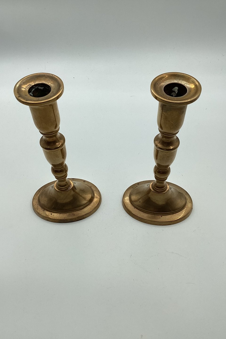 Pair of brass candlesticks. Produced in Denmark c. 1950. In good condition. At the bottom marked: Danish Handmade "Glinde Line". H. 19 cm (7.48 inches)