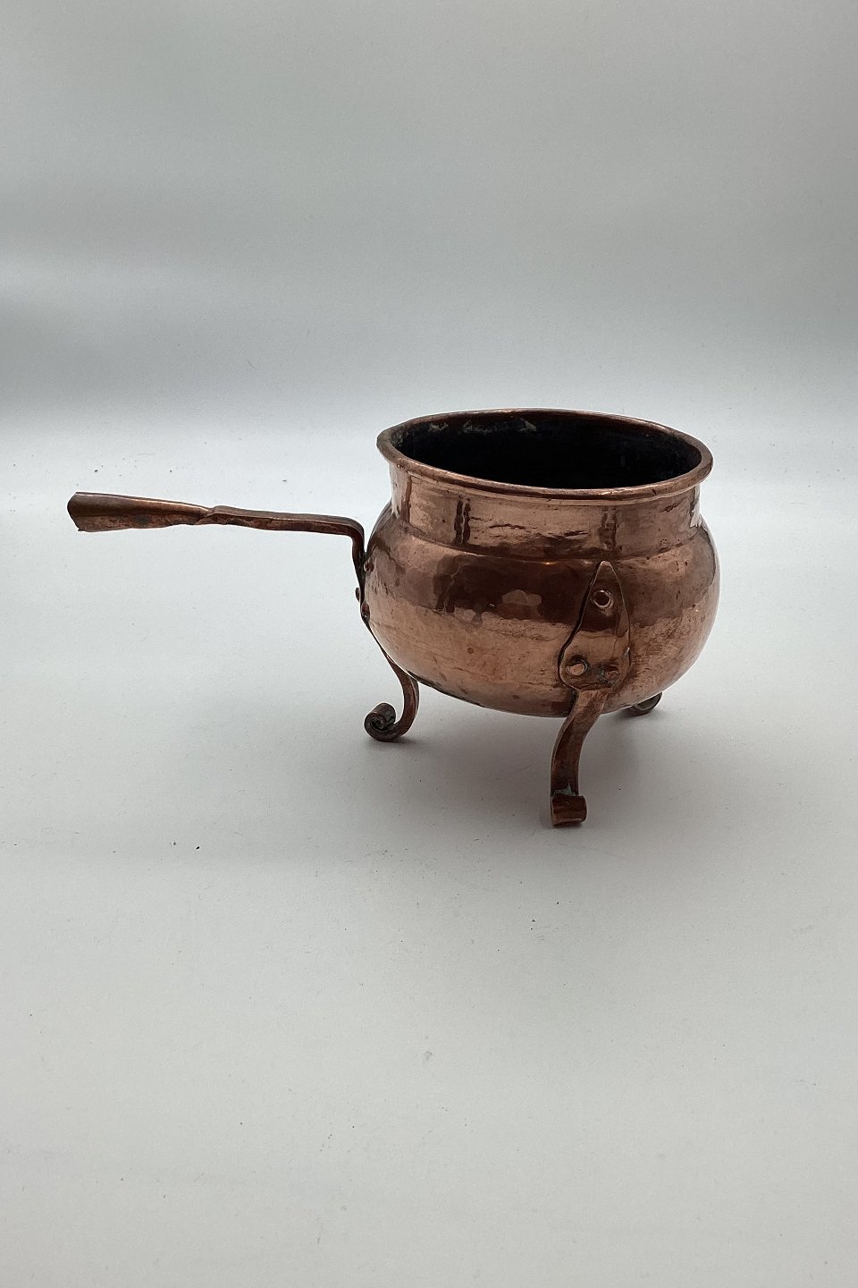 Smaller Danish copper pot with handle standing on three legs from approx. 1850. In good condition. Tinned inside. Dimensions: H. 11 cm (4.33 inches) L. 21 cm (8.26 inches). Opening diameter 10 cm (3.93 inches)