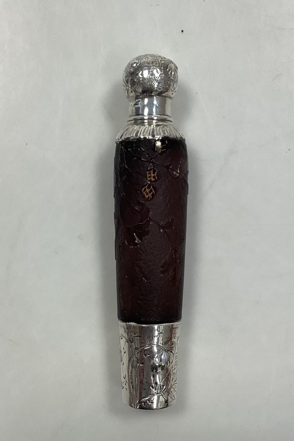 Fransk Antik Art Nouveau flacon i bordeaux glas med blomsterdekorationer og bladværk i relief fra slutningen af 19. årh. I både top og bund sølvmontering med sølvstempel. I god stand. Ingen skader. H. 15 cm (5.91 inch)