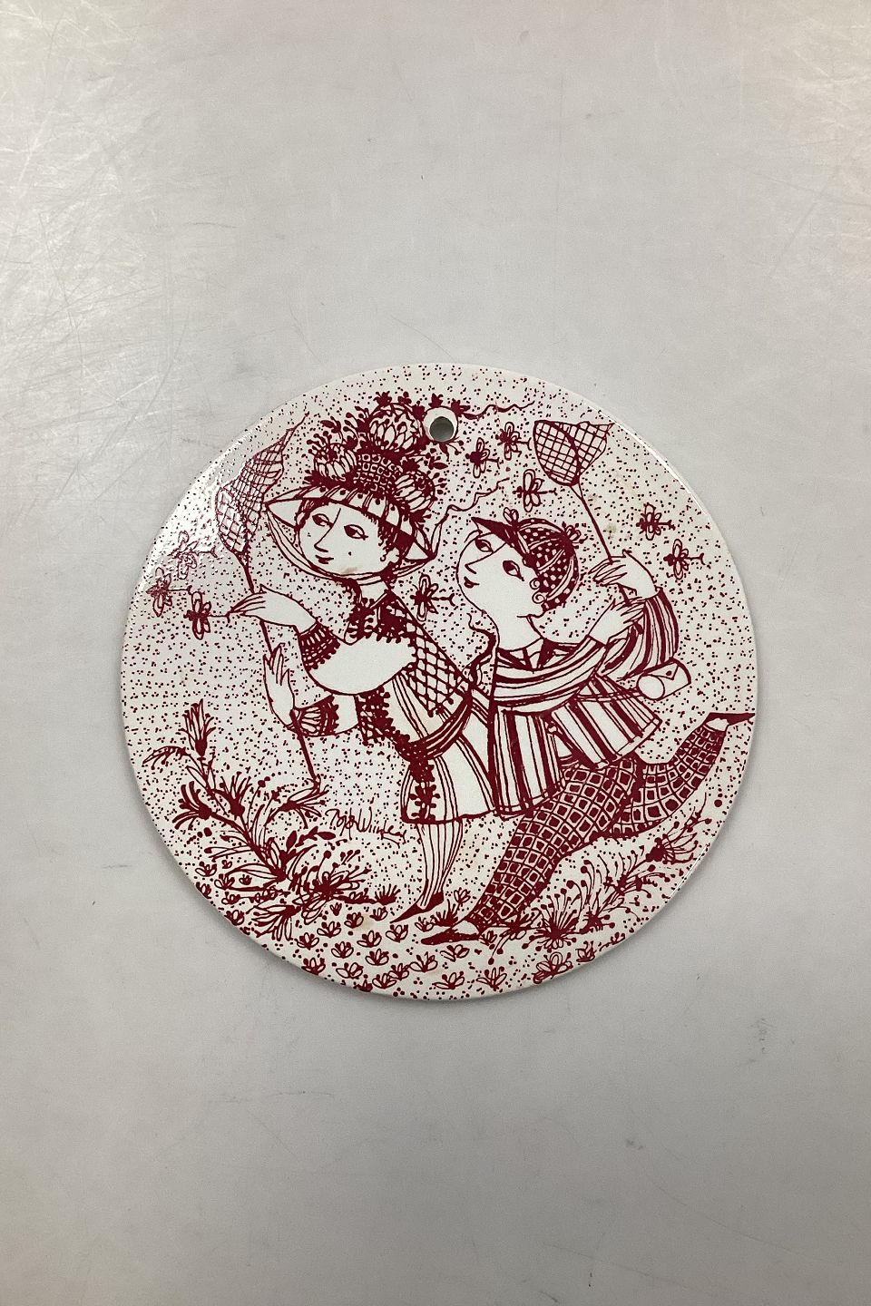 Rød månedsplatte i fajance for august måned - BYE-BYE. Designet af Bjørn Wiinblad for Nymølle. I god stand. Fabriksmærket på bagsiden. Mål: 15 cm (5.90 inch.)