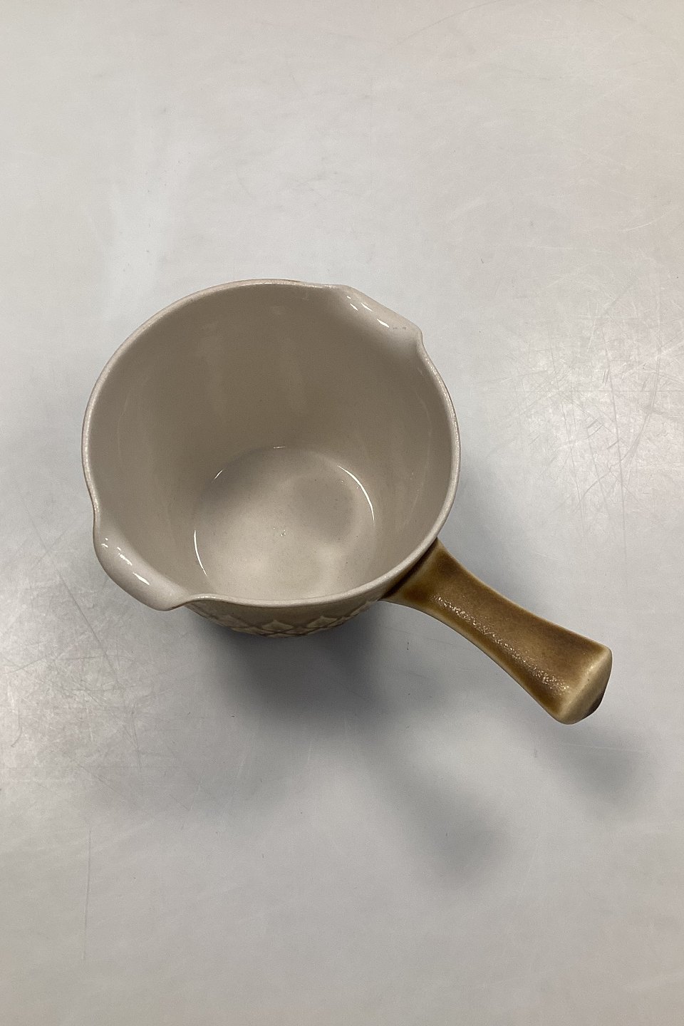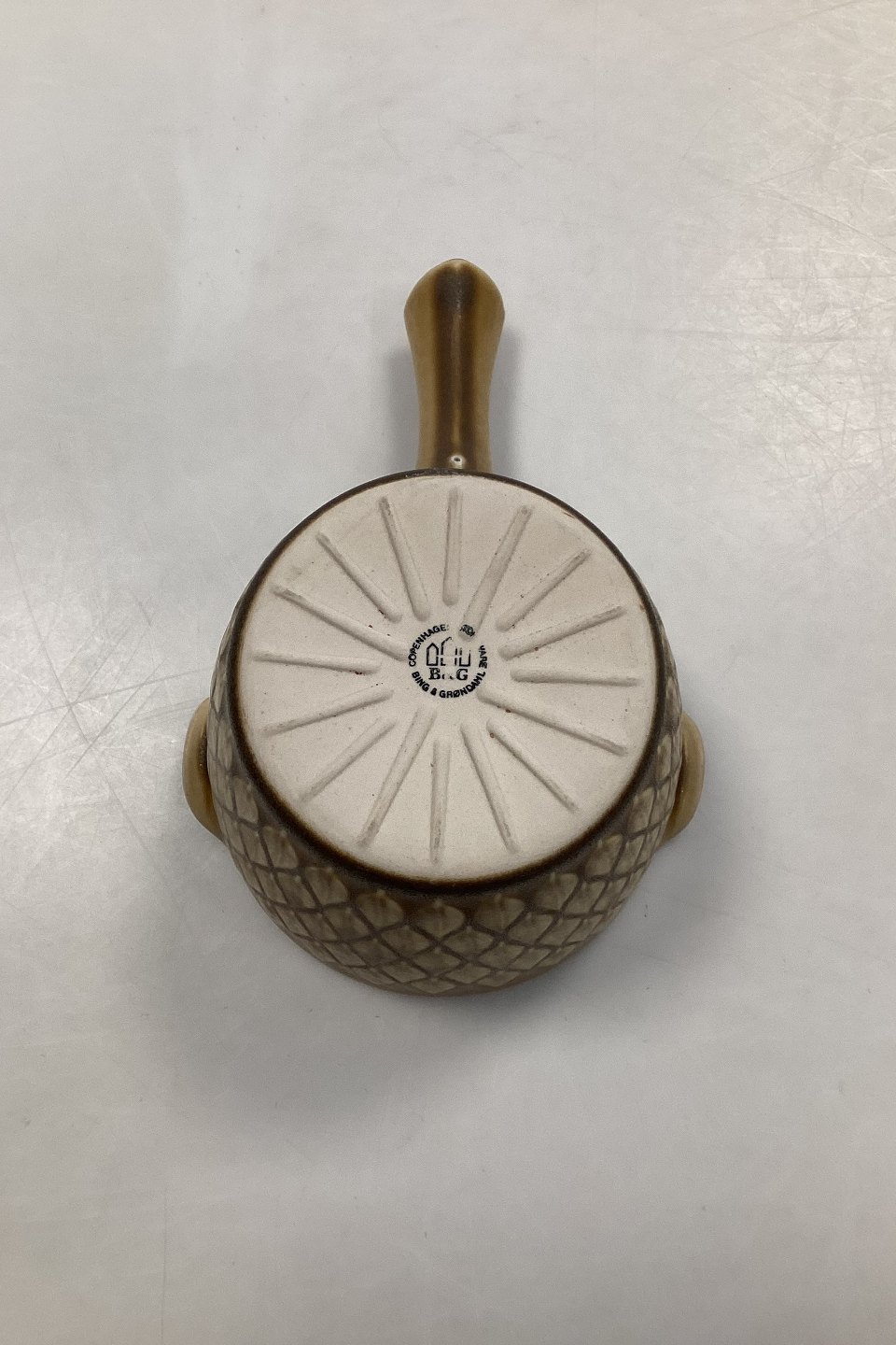 Bing and Grøndahl / Kronjyden Relief Gravy Boat. Design: Jens Quistgaard. Measures 18.5 cm/7 inch. with handle x 9.3 cm/3.6 inch. high.