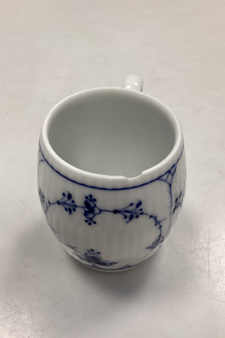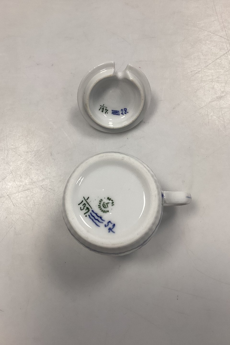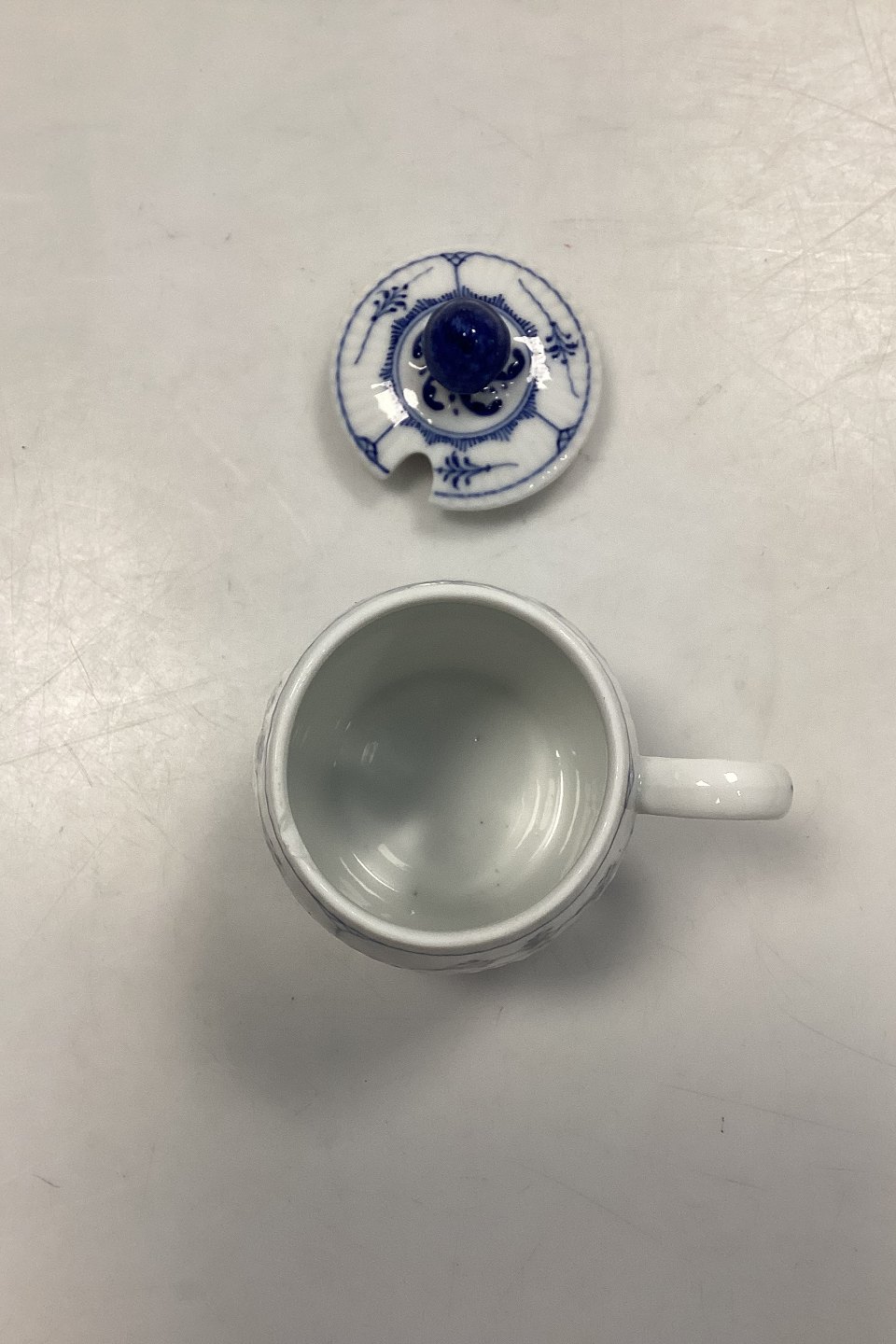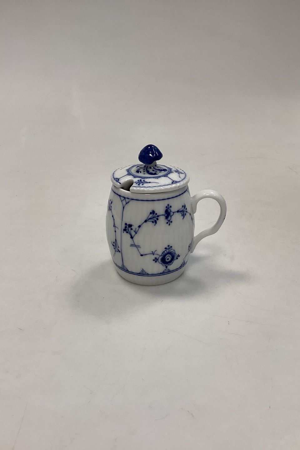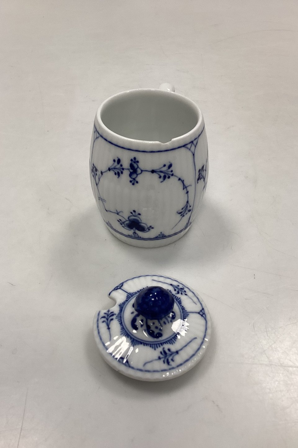 Royal Copenhagen Musselmalet Riflet Sennepskrukke med låg No. 137. Lille skår i koppen øverst på kanten.