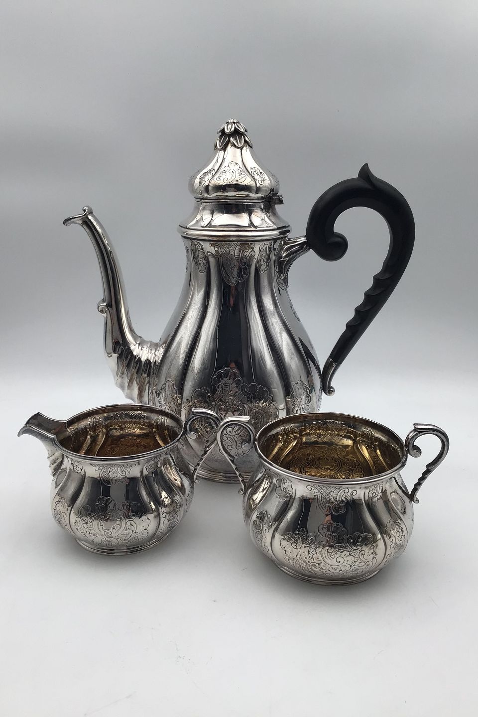 Svend Toxværd Sølv Kaffesæt (3) Måler Kaffekande H 25 cm (9.84 inch) Fløde/Sukker 8 cm (3.14 inch) Samlet vægt 1007 gr (35.52 oz)