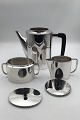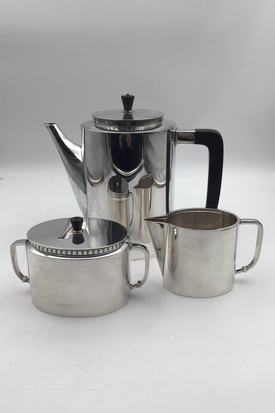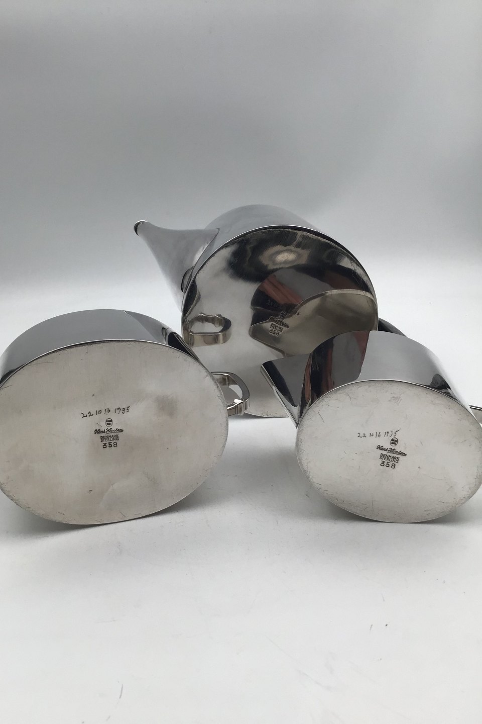 Hans Hansen Sterling Sølv Kaffesæt. Består af kaffekande, flødekande og sukkerskål No 358 af Karl Gustav Hansen. Kaffekande med håndtag af træ. Mål: Kaffekande 18.5 cm (7.28 inch), vægt 777 gram (27.41 oz). Flødekande 7.5 cm (2.95 inch), vægt 202 gram.(7.10 oz) Sukkerskål 8.5 cm (3.34 inch), vægt 347 gram(12.24 oz).