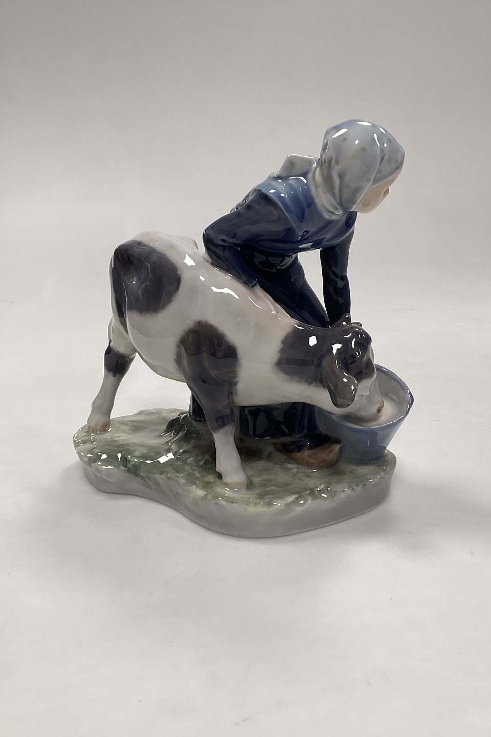 Royal Copenhagen Figurine Girl with Calf No. 779. Measures 16 cm x 17 cm (6 19/64 in. x 6 11/16 in.) Designed by Christian Thomsen.