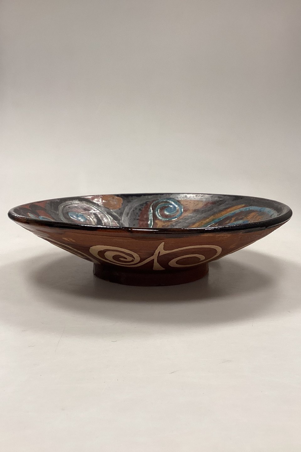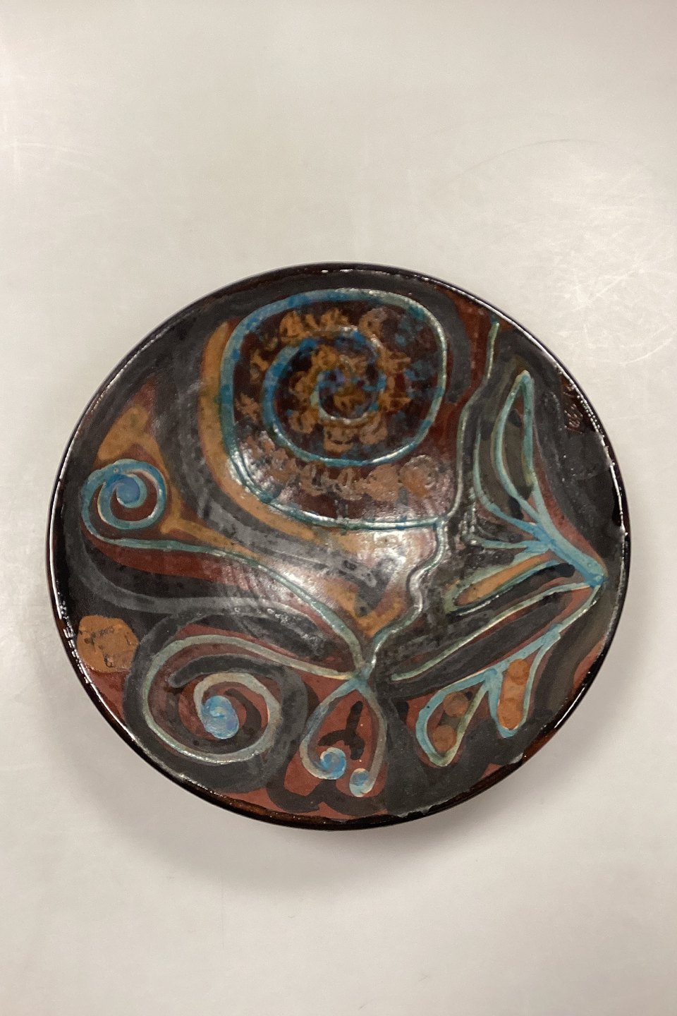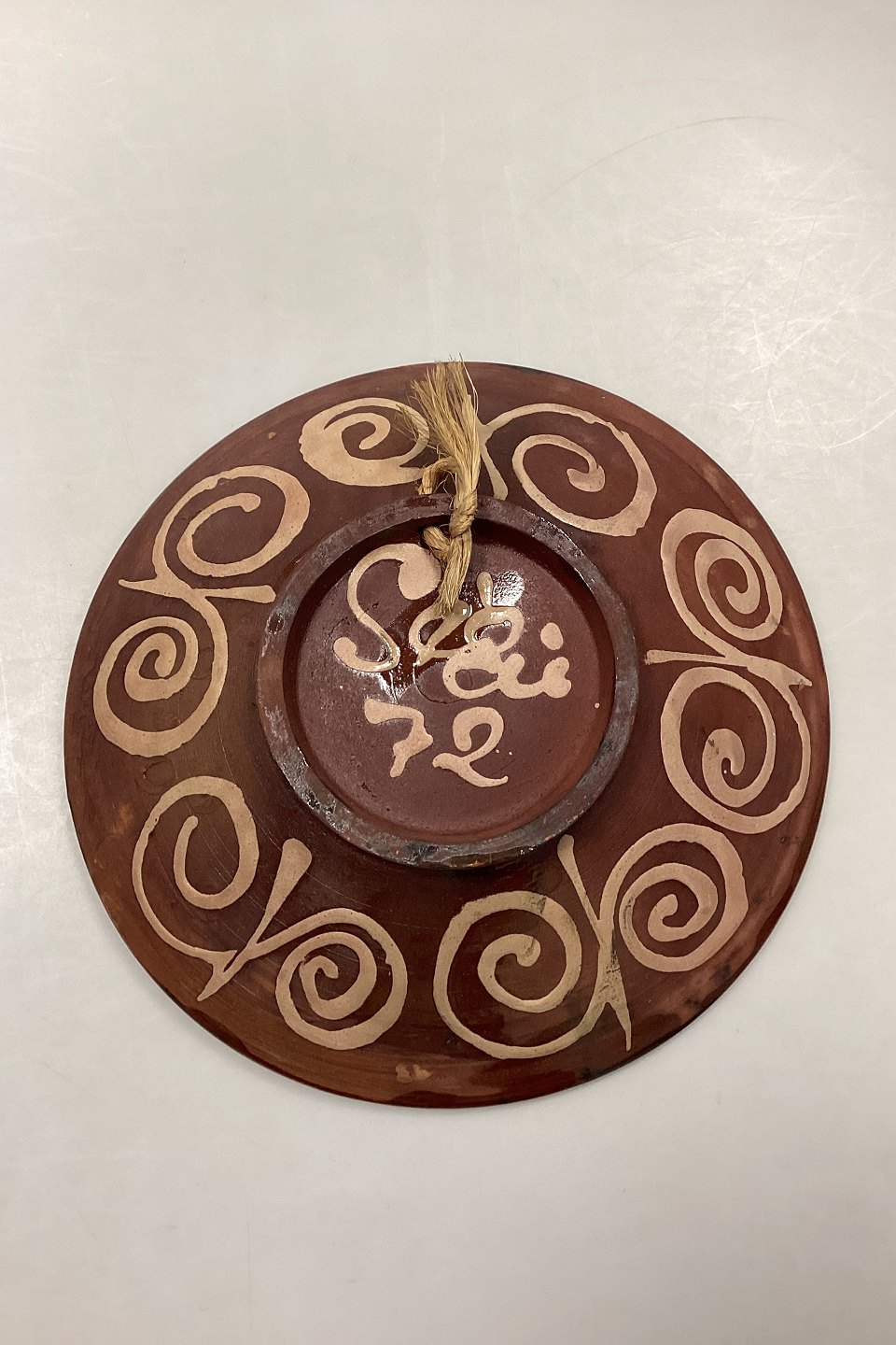 Stentøjsskål i brune, gule og blå nuancer med hul til vægophæng. Kunstner ukendt. Muligvis signeret Saqú 72.