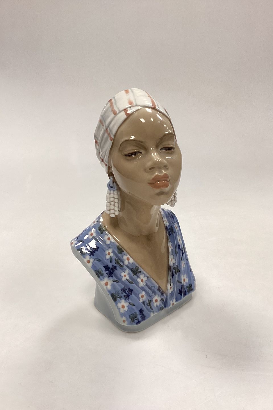 Dahl Jensen Figur No. 1211 - Buste af Afrikansk Kvinde. Måler 20 cm x 12 cm / 7,87 in. x 4,72 in. 2. Sortering i god stand, men med små sorte urenheder (brændingsfejl) på halsen og bag på soklen.