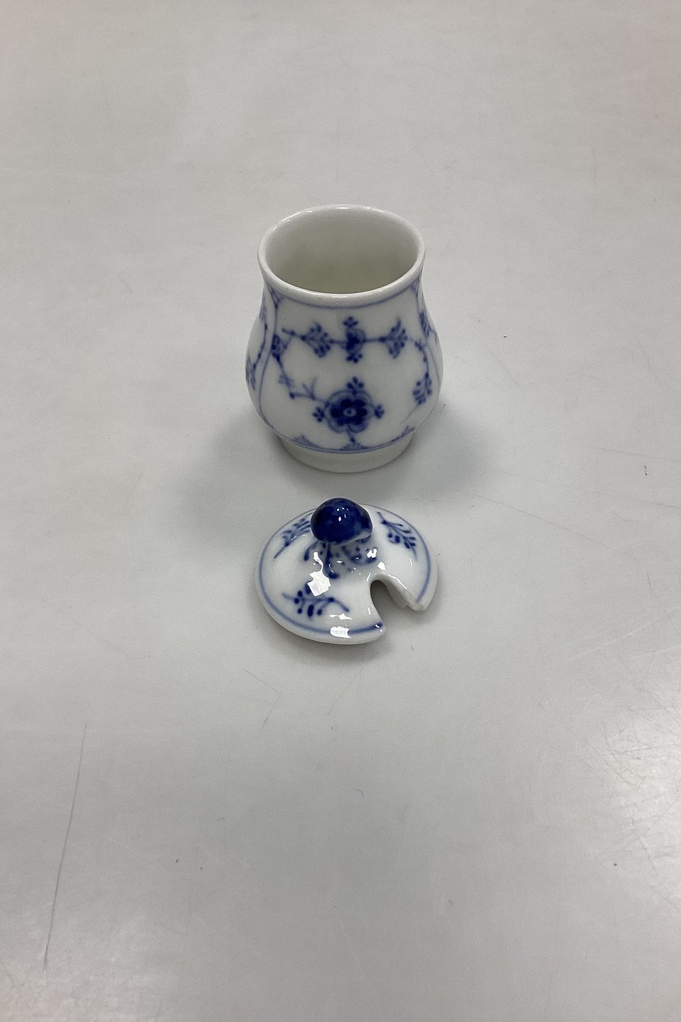 Royal Copenhagen Musselmalet Riflet Lille Sennepskrukke No. 358. Måler 7 cm / 2,75 in. Lille afslag på låget, se foto.