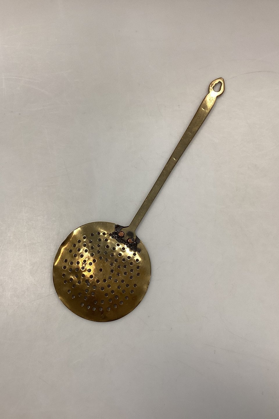 Antique brass skimming spoon with copper rivets. Somewhat bent and dented at the edge. Measures 33 cm / 12.99 in.