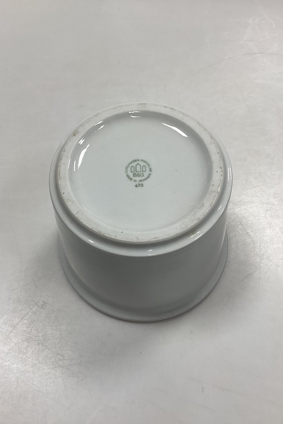 Bing og Grøndahl Urtepotteskjuler No. 670 fra Apotekerserien designet af Bo Bonfils i 1970'erne. Måler 11 cm x 14,5 cm Ø / 4,33 in. x 5,70 in.