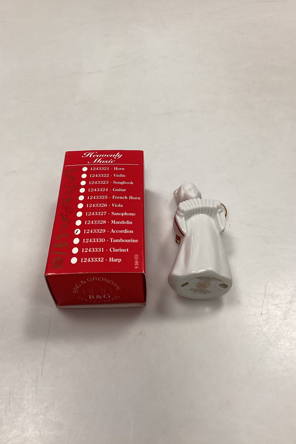 Bing og Grøndahl Figur Heavenly Music Engel - Harmonika No. 9. Juleornament i blanc de chine porcelæn med guld og snor til ophæng. Måler 9,5 cm / 3,74 in.