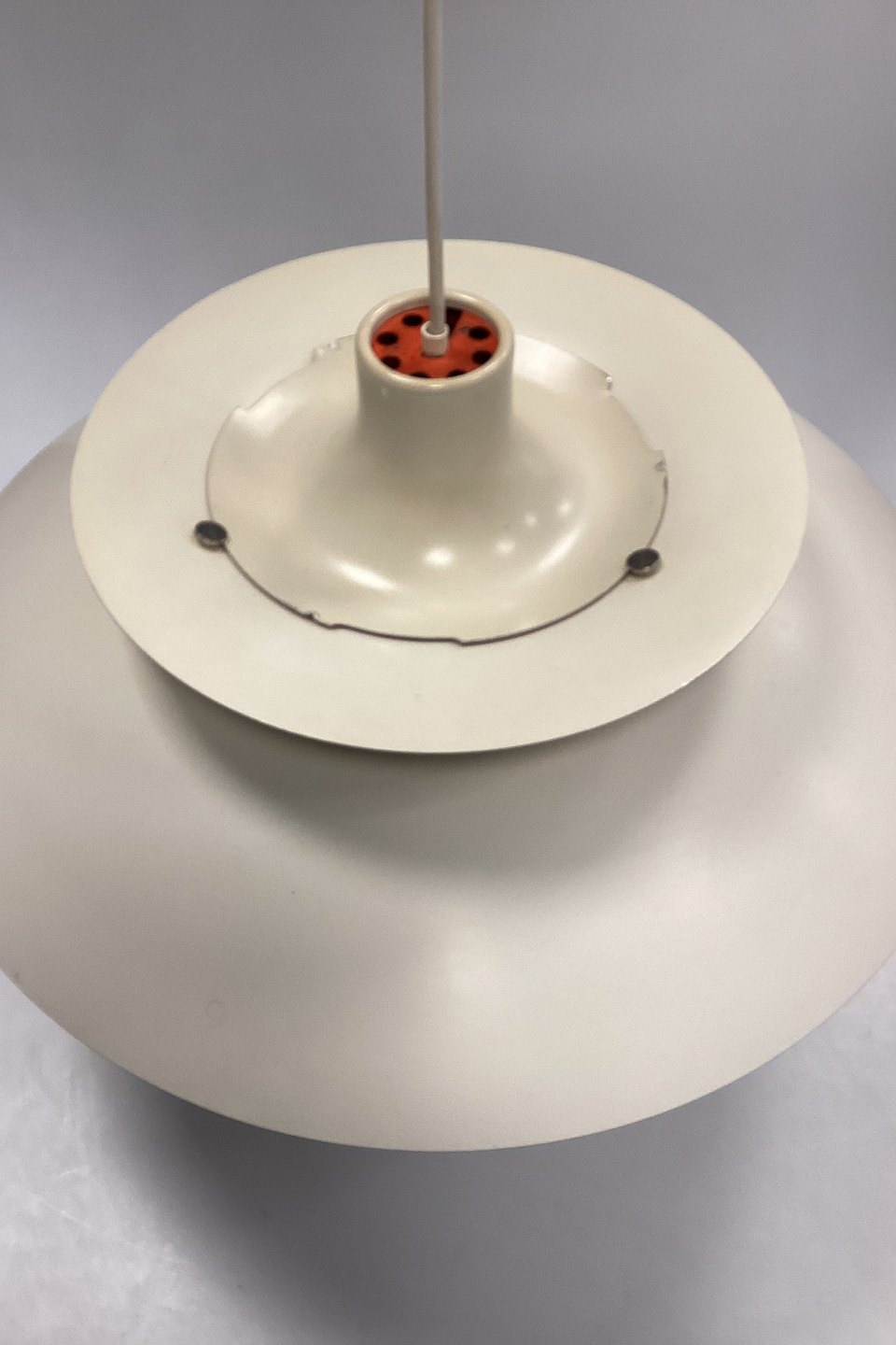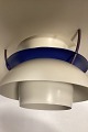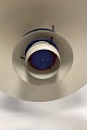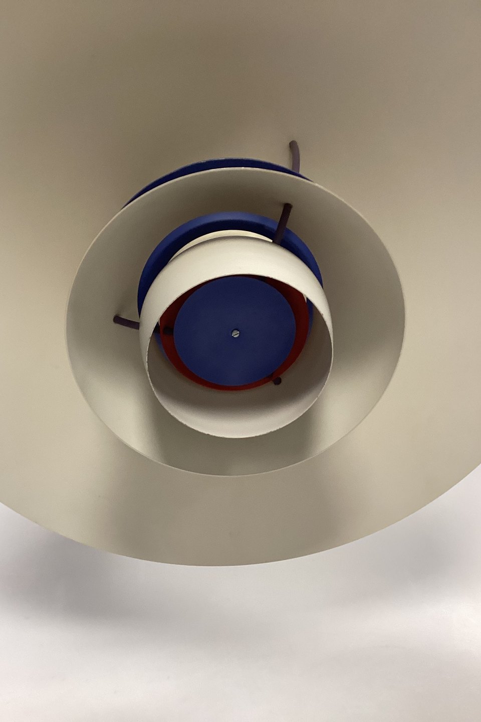 Poul Henningsen for Louis Poulsen Hvid pendel PH 5. Blå og rød inderskærm. Lille bule på den blå skærm, se foto. Måler 50 cm x 26,7 cm / 19,68 in. x 10,51 in.