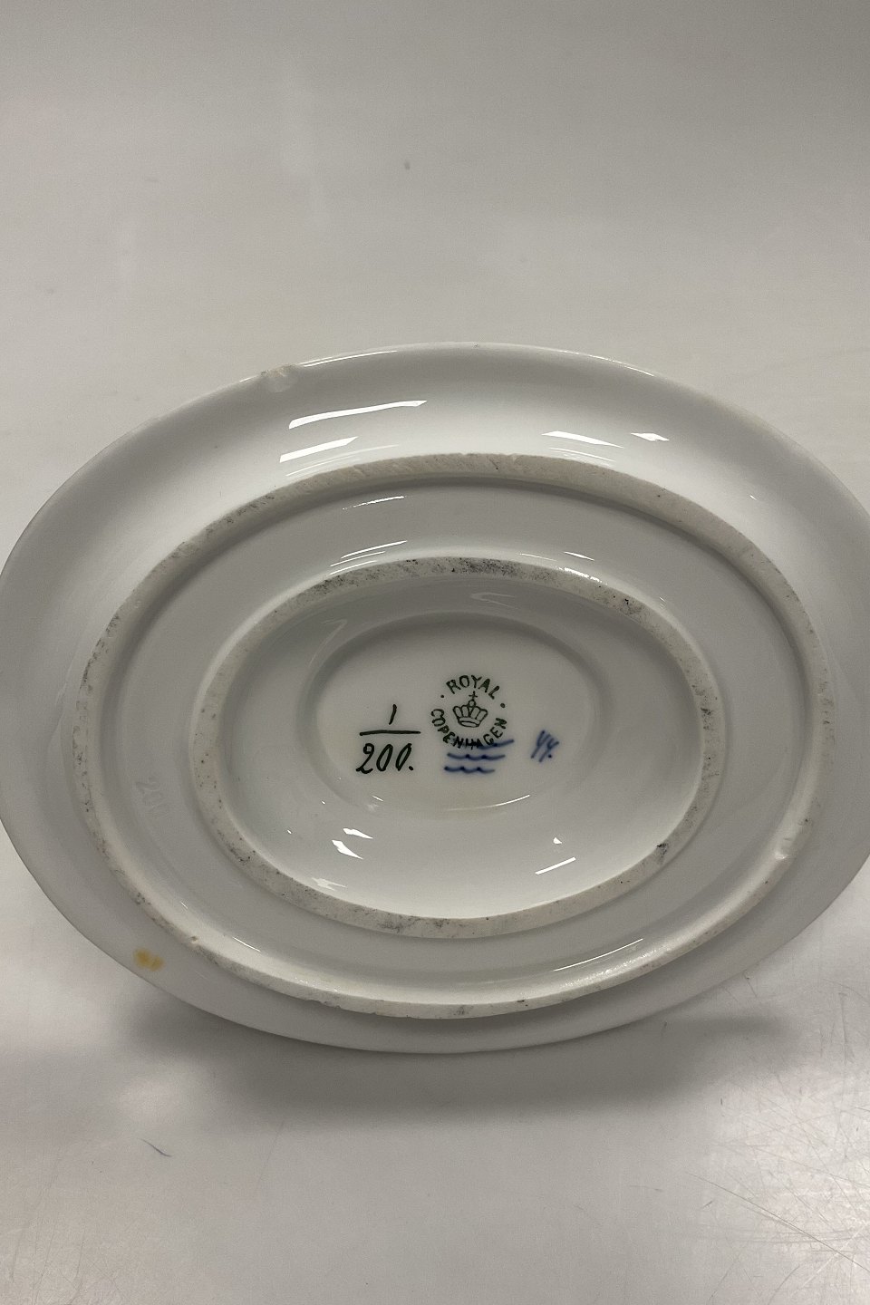 Royal Copenhagen Blue Fluted Plain Saucebowl with handle and saucer No 200. Measures 20 cm x 14 cm / 7 7/8 in. x 5 33/64 in.