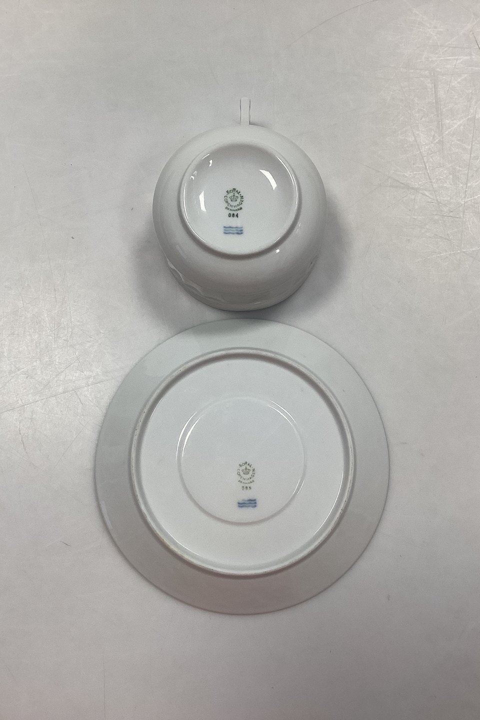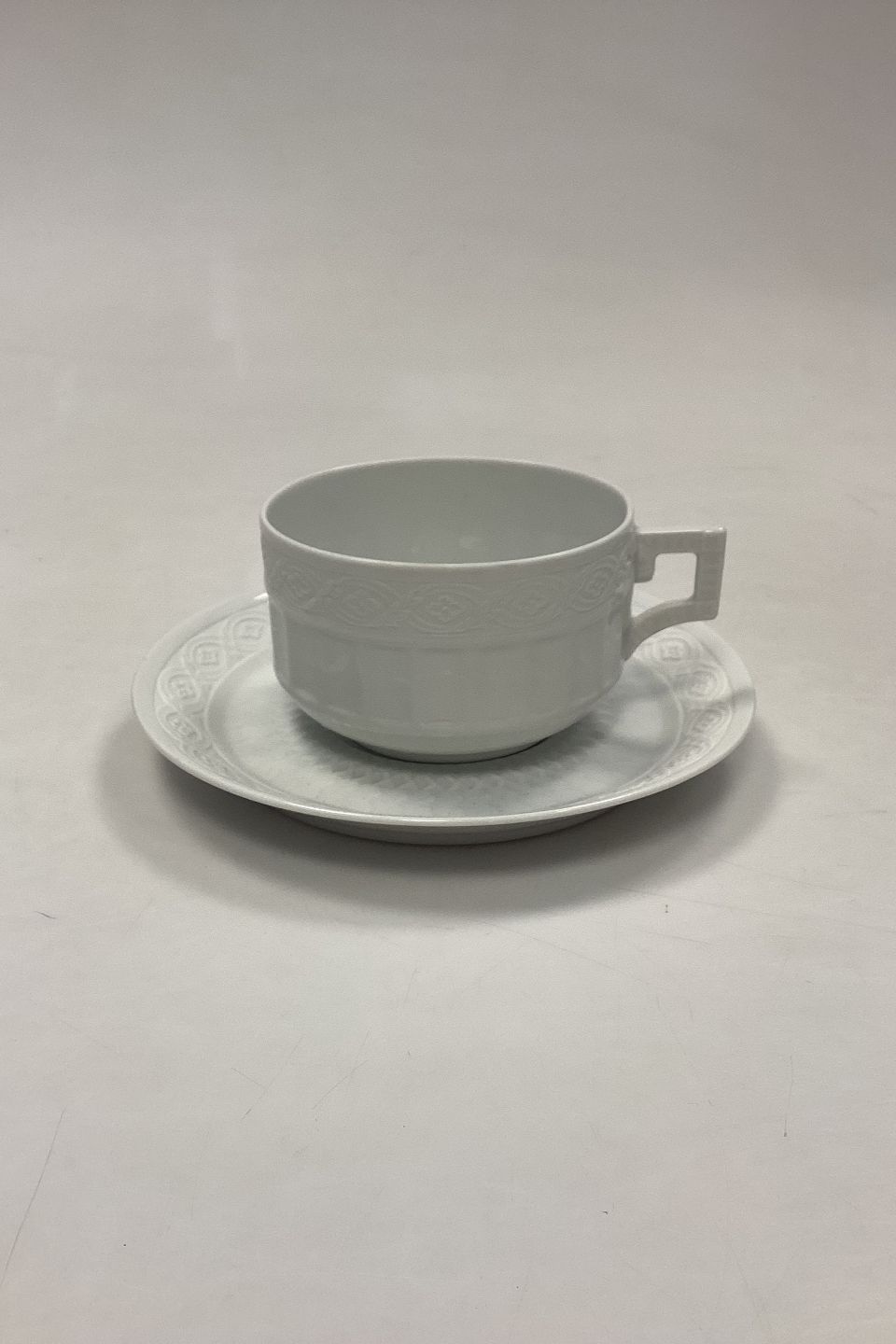 Royal Copenhagen Hvid Vifte Tekop med Underkop No. 84/11554. Kop: 6.5 cm x 10 cm / 2.55 in. x 3.93 in. Underkop: 17 cm / 6.69 in.