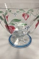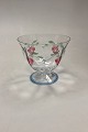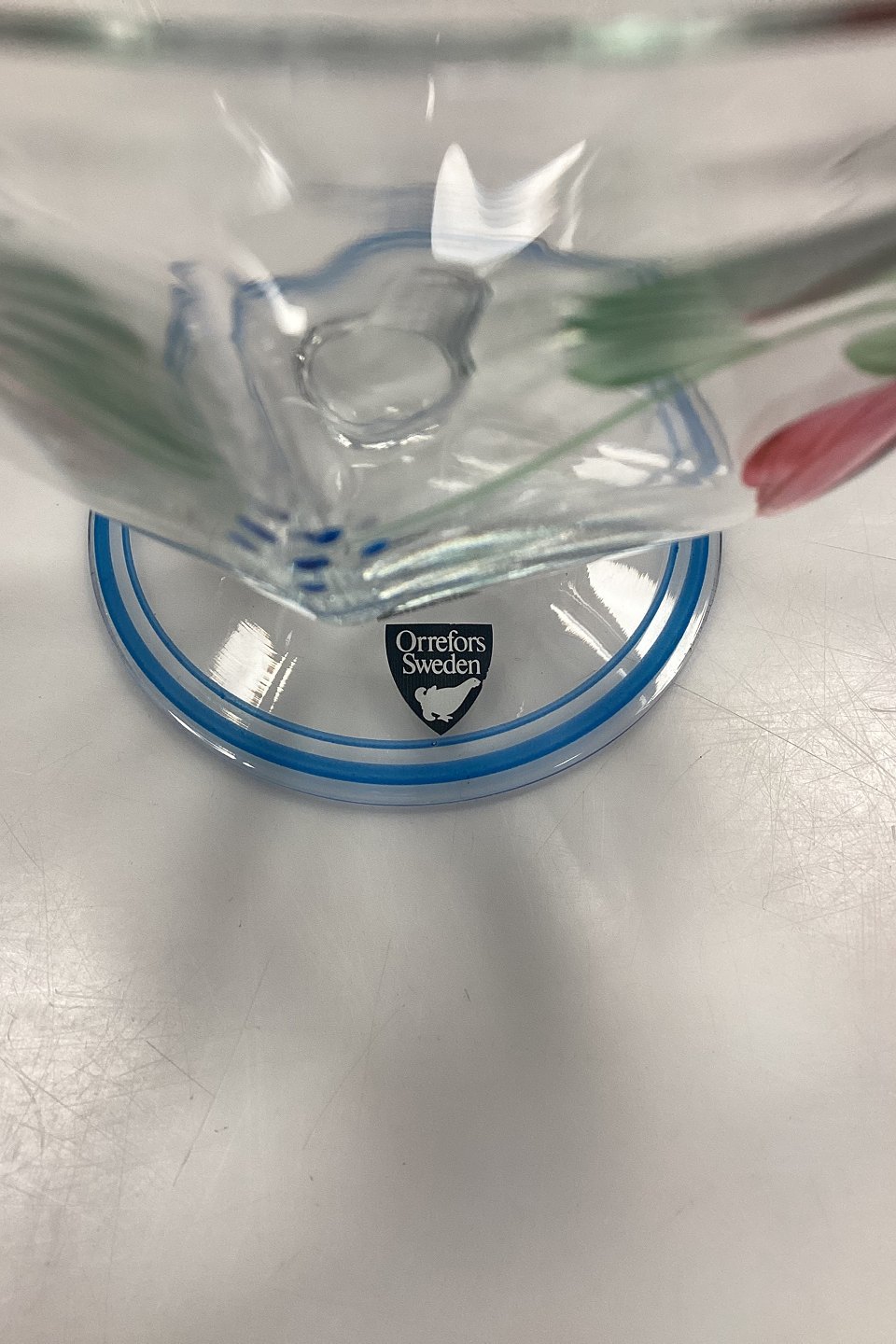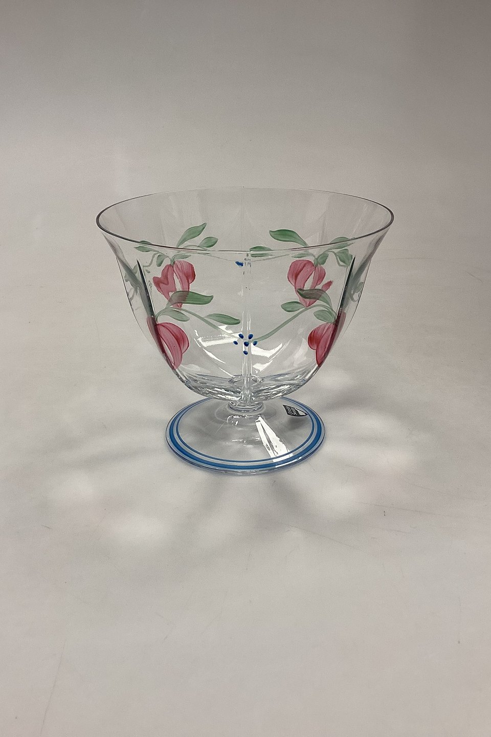 Orrefors Maja Glass bowl with red flowers and blue striped rim on foot. Designed by Eva Englund. Signed EE.AL. Made in Sweden.