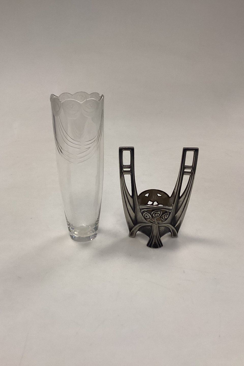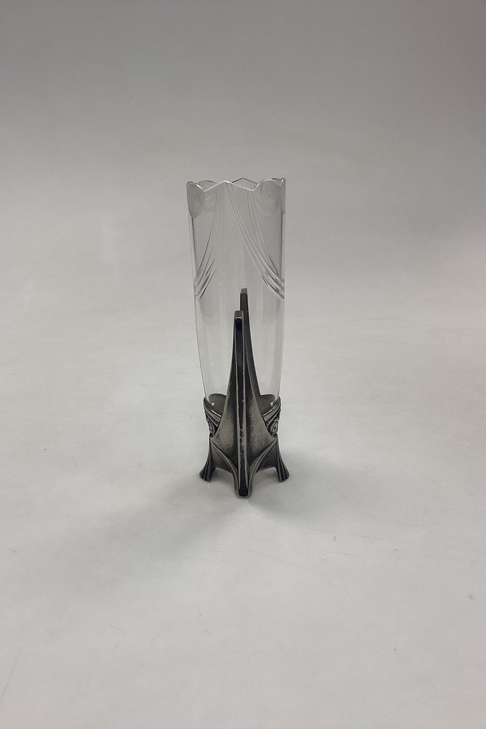 WMF Art Nouveau Vase No. 115 A. Fabrikeret i Tyskland omkring år 1900 af Württembergische Metallwarenfabrik. Glasvase med facetslebne guirlander og matslebne roser øverst i kanten. Glasholderen er lavet i oxideret tin, og ligeledes dekoreret med roser. I meget fin stand.